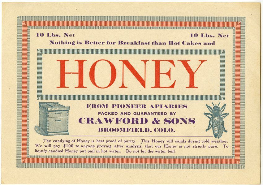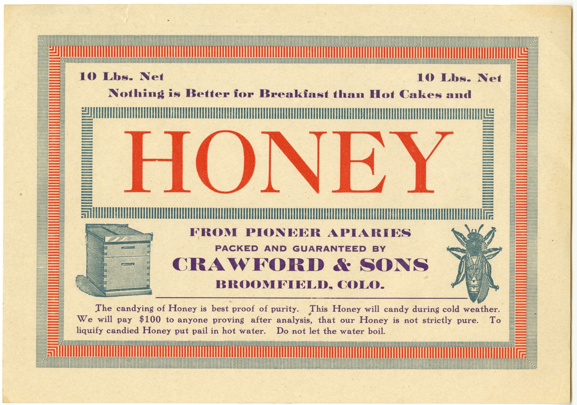 From pioneer apiaries, packed and guaranteed by Crawford & Sons, Broomfield, Colo.