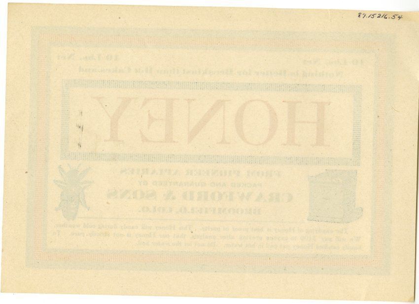 The candying of Honey is best proof of purity. This Honey will candy during cold weather. We will pay $100 to anyone proving, after analysis, that our Honey is not strictly pure. To liquify candied Honey put pail in hot water. Do not let the water boil."Collection