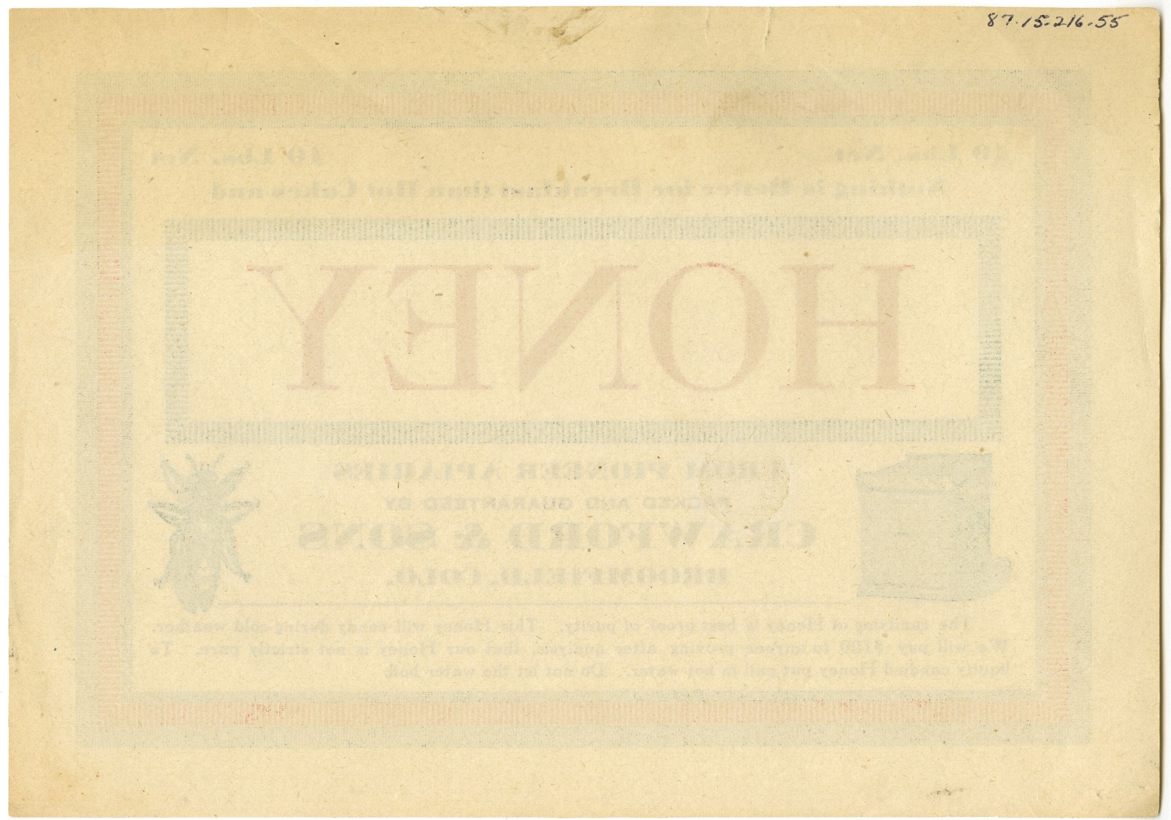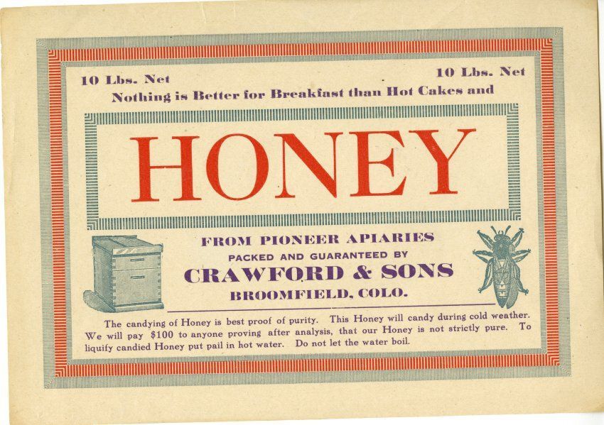 From pioneer apiaries, packed and guaranteed by Crawford & Sons, Broomfield, Colo.