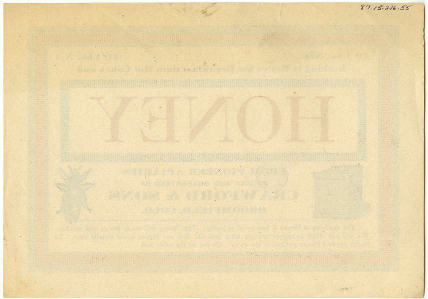 The candying of Honey is best proof of purity. This Honey will candy during cold weather. We will pay $100 to anyone proving, after analysis, that our Honey is not strictly pure. To liquify candied Honey put pail in hot water. Do not let the water boil."Collection