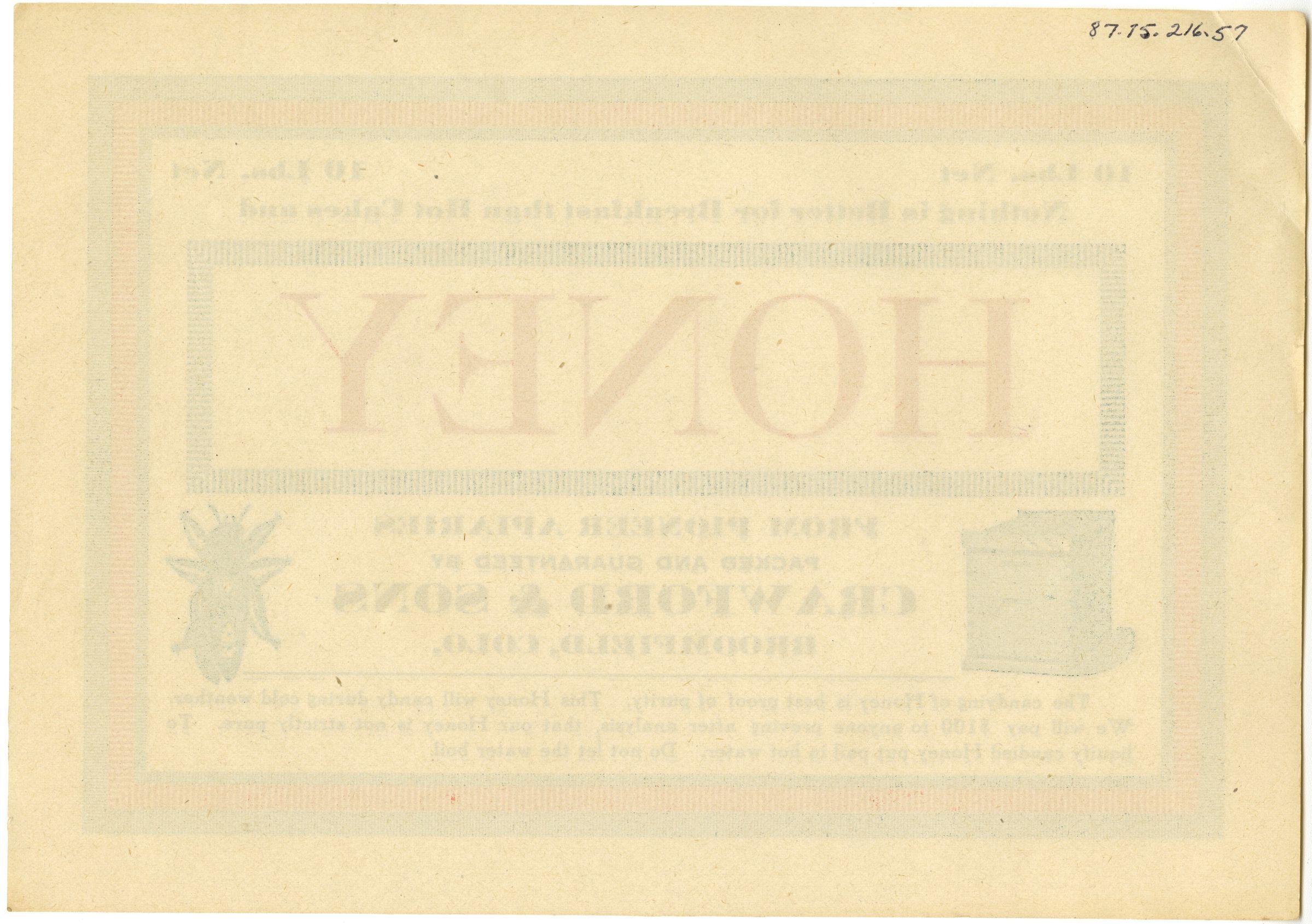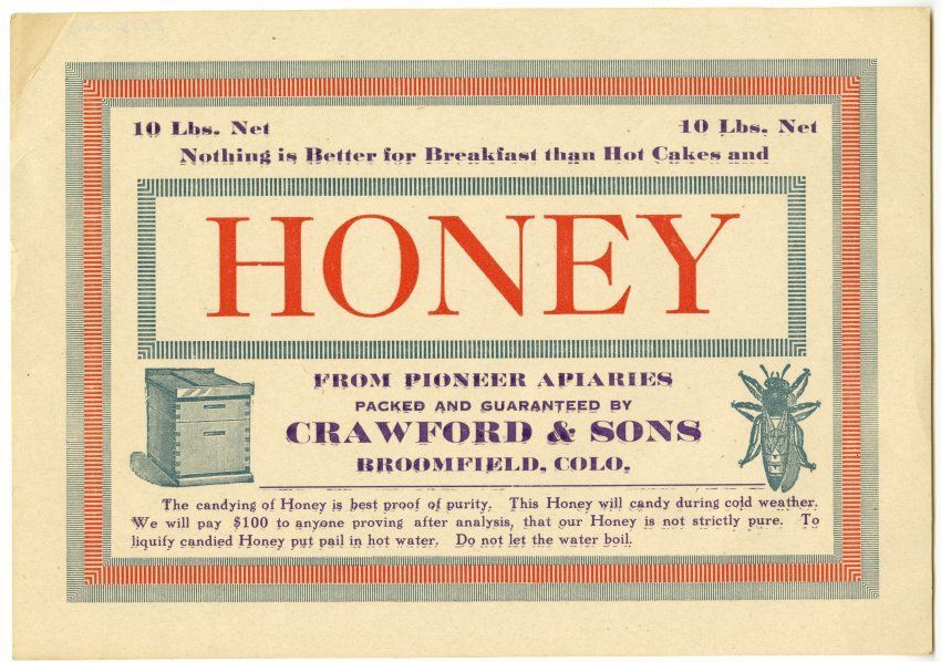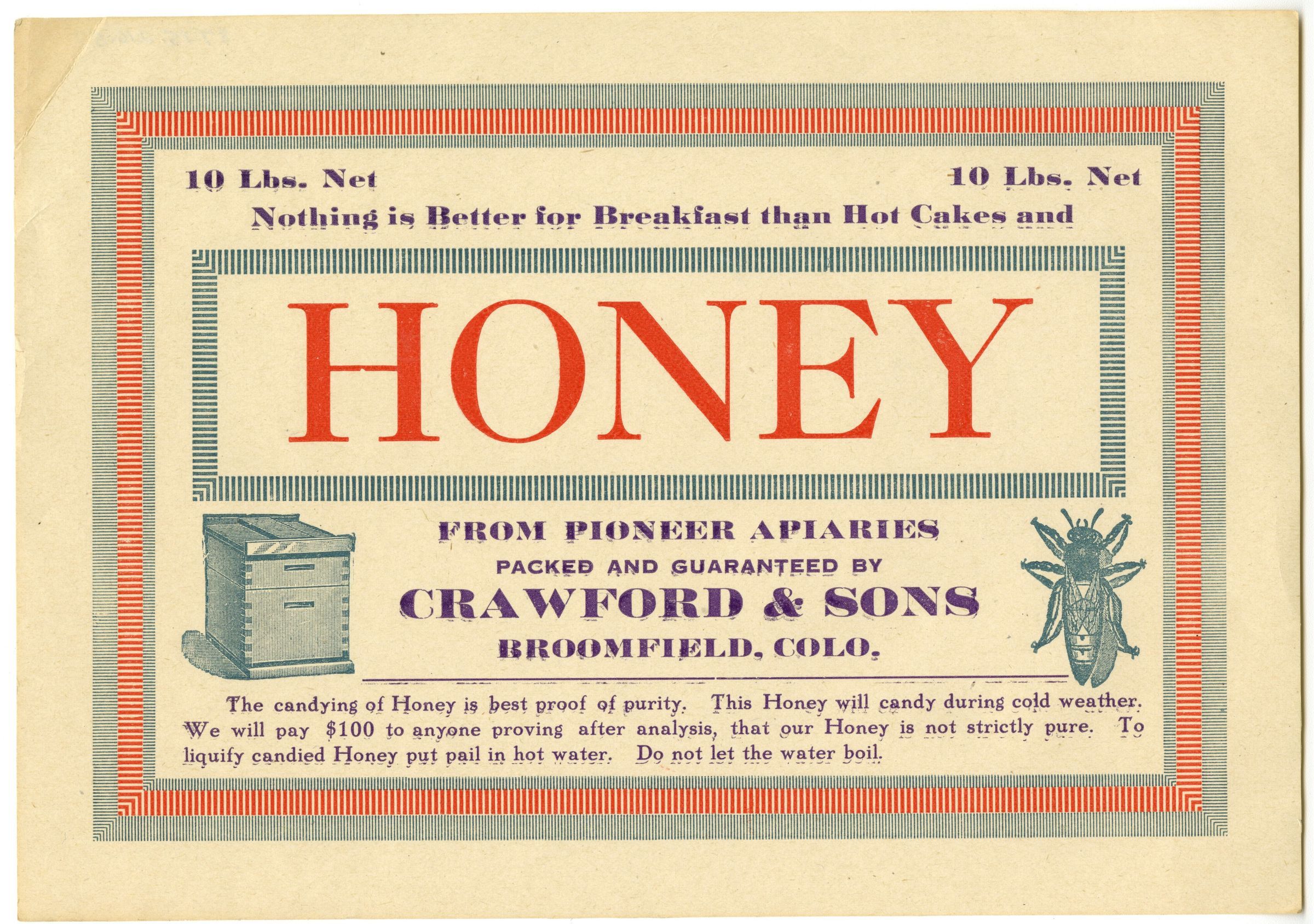 From pioneer apiaries, packed and guaranteed by Crawford & Sons, Broomfield, Colo.