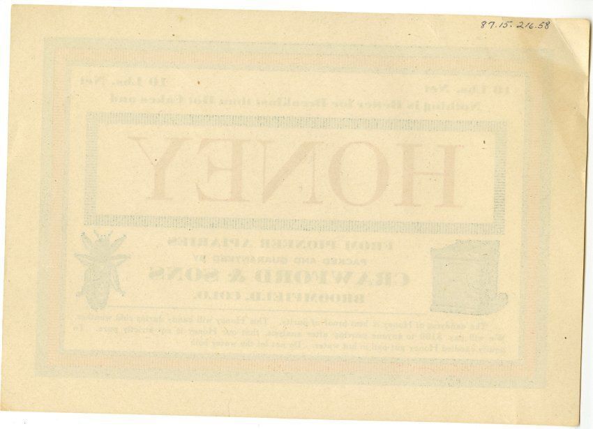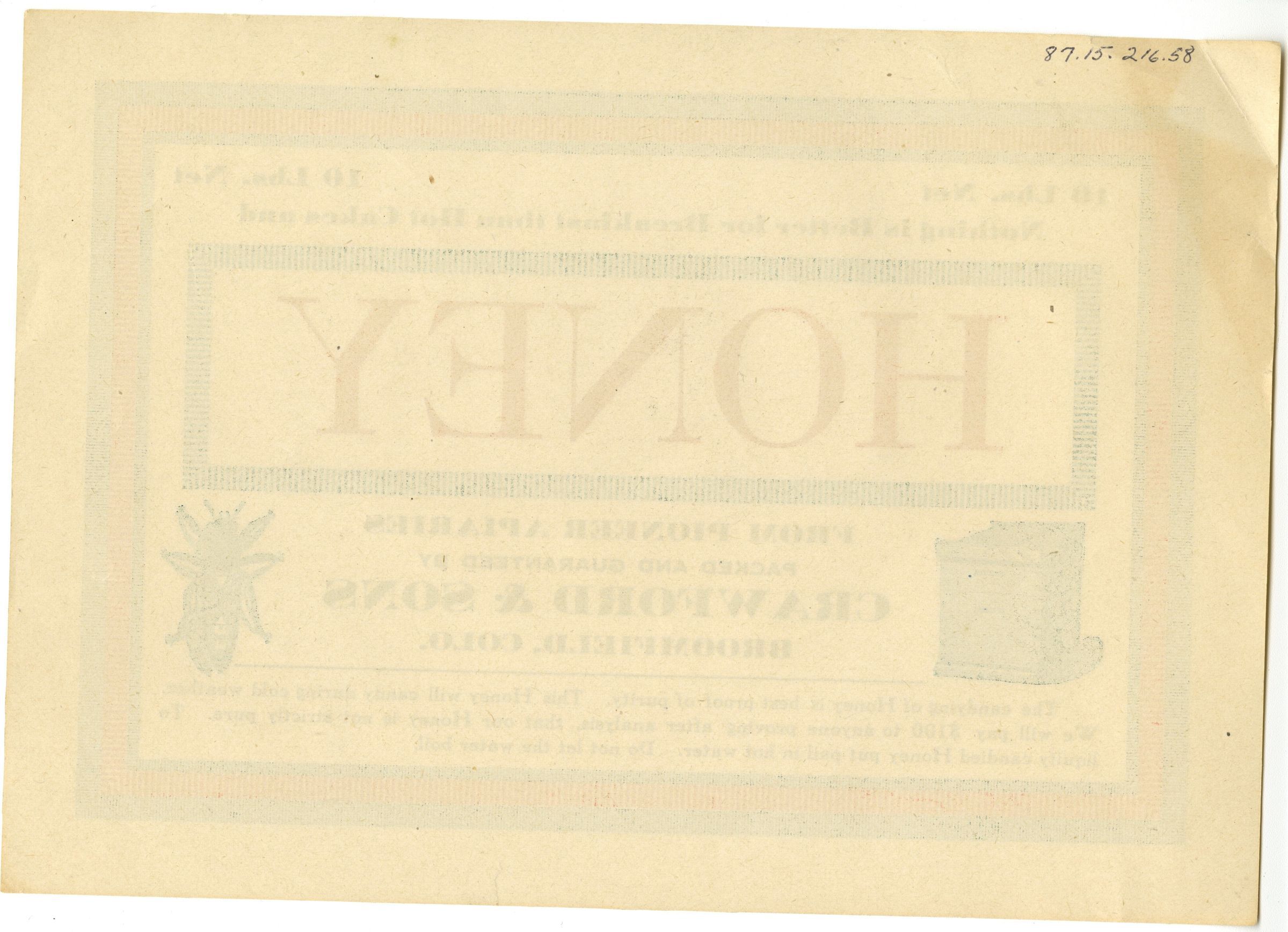 From pioneer apiaries, packed and guaranteed by Crawford & Sons, Broomfield, Colo.