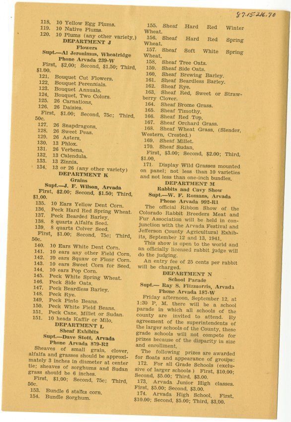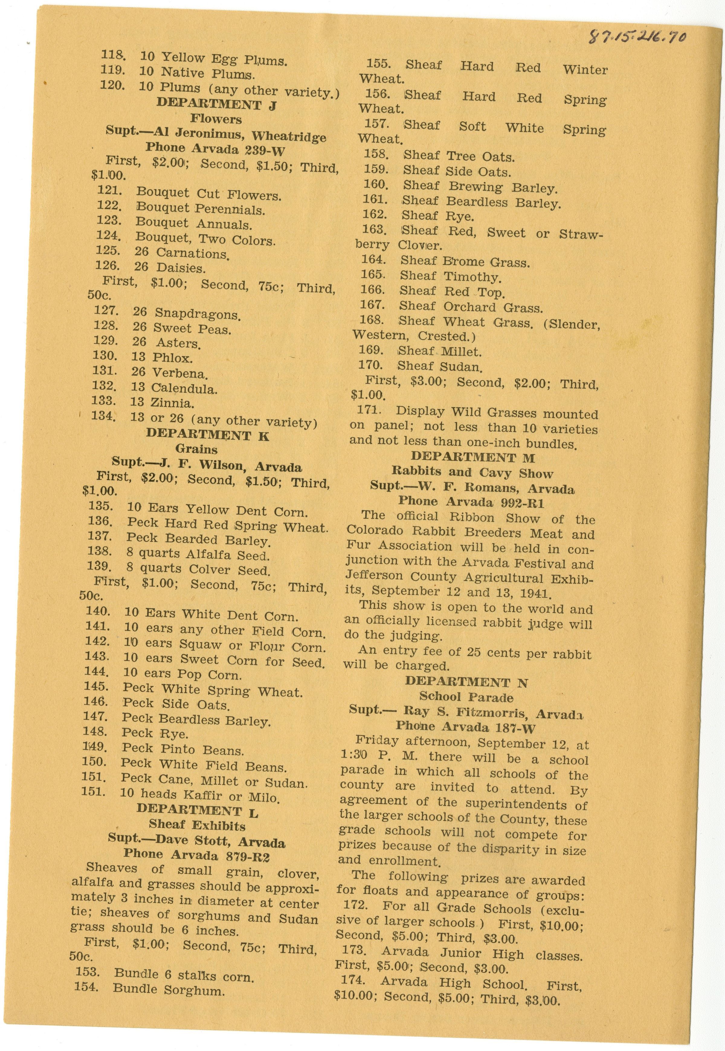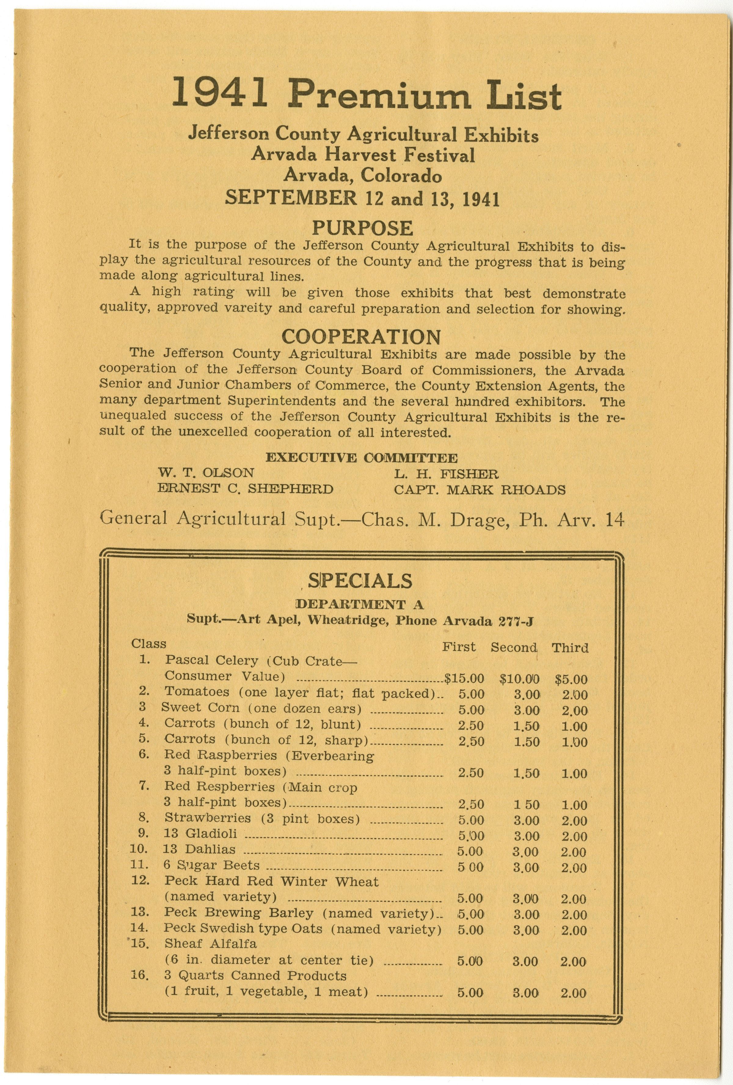 1941 Premium List of the Jefferson County Agricultural Exhibits. Arvada Harvest Festival, Arvada Colorado. September 12 and 13, 1941.