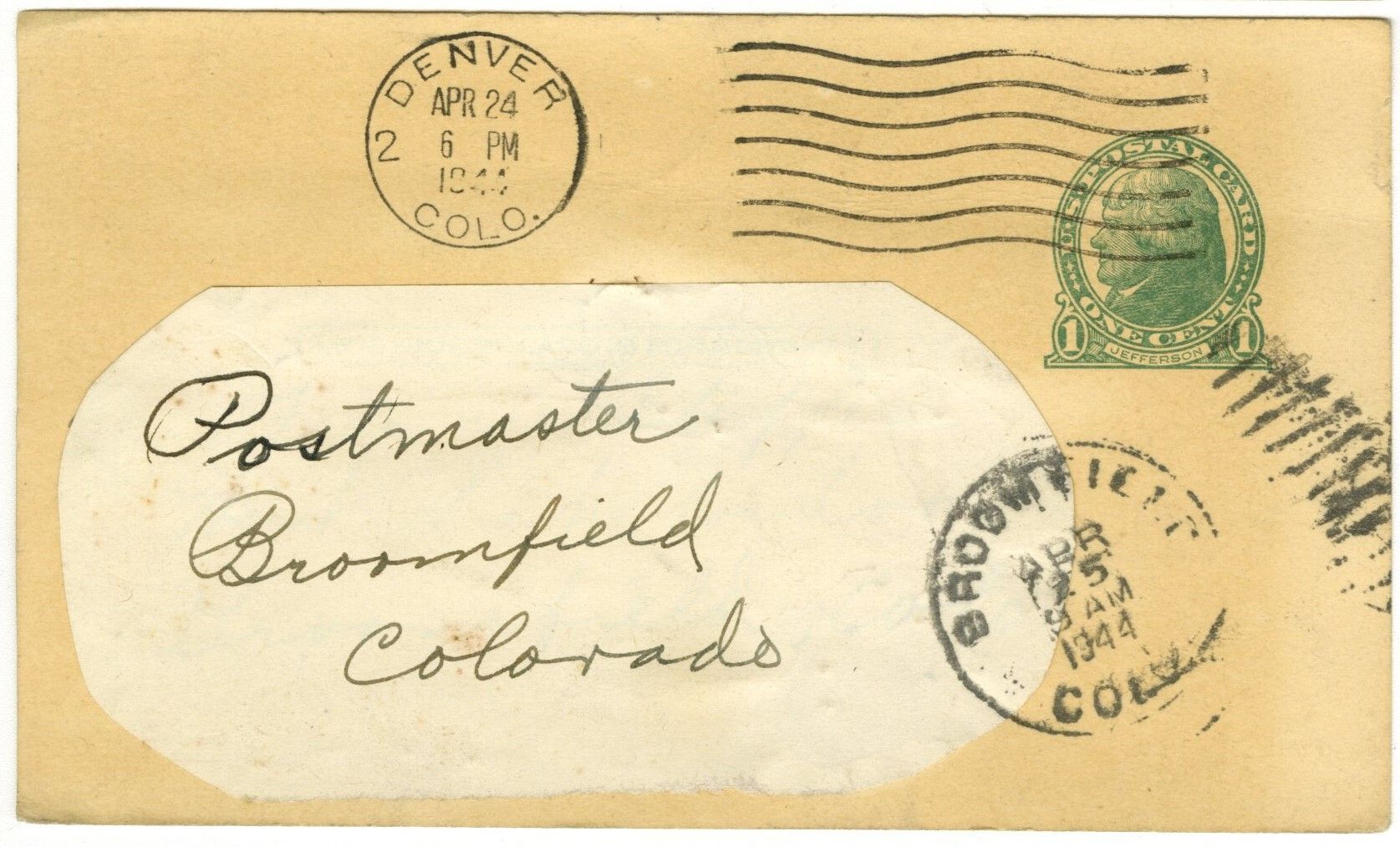 Card addressed to Postmaster, Broomfield, Colorado. Postal stamp: Denver Colo, April 24, 1944. Second postal stamp: Broomfield Colo, April 25, 1944. Postage stamp: green, 1c.