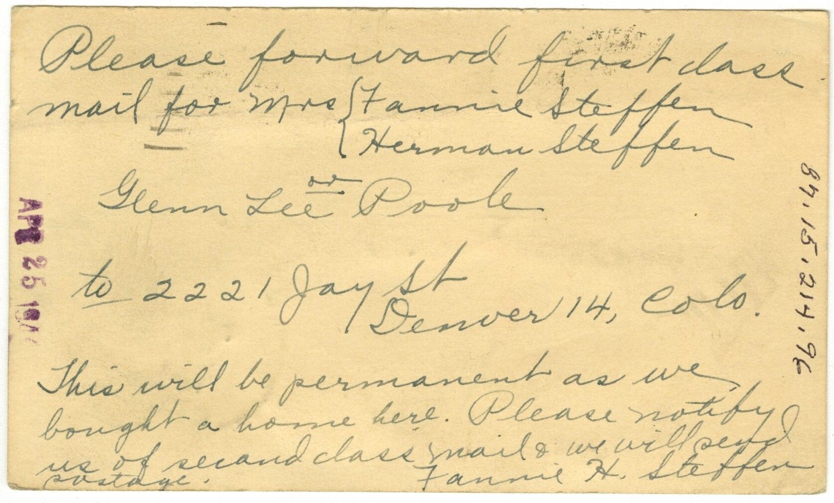 On back, "Please forward first class mail for Mrs. Fannie Steffen and Herman Steffen or Glenn Lee Poole to 2221 Jay St, Denver 14, Colo. This will be permanent as we bought a home here. Please notify us of second class mail + we will send postage. -Fannie H. Steffen." Includes purple stamp "Apr 25 1944."Collection