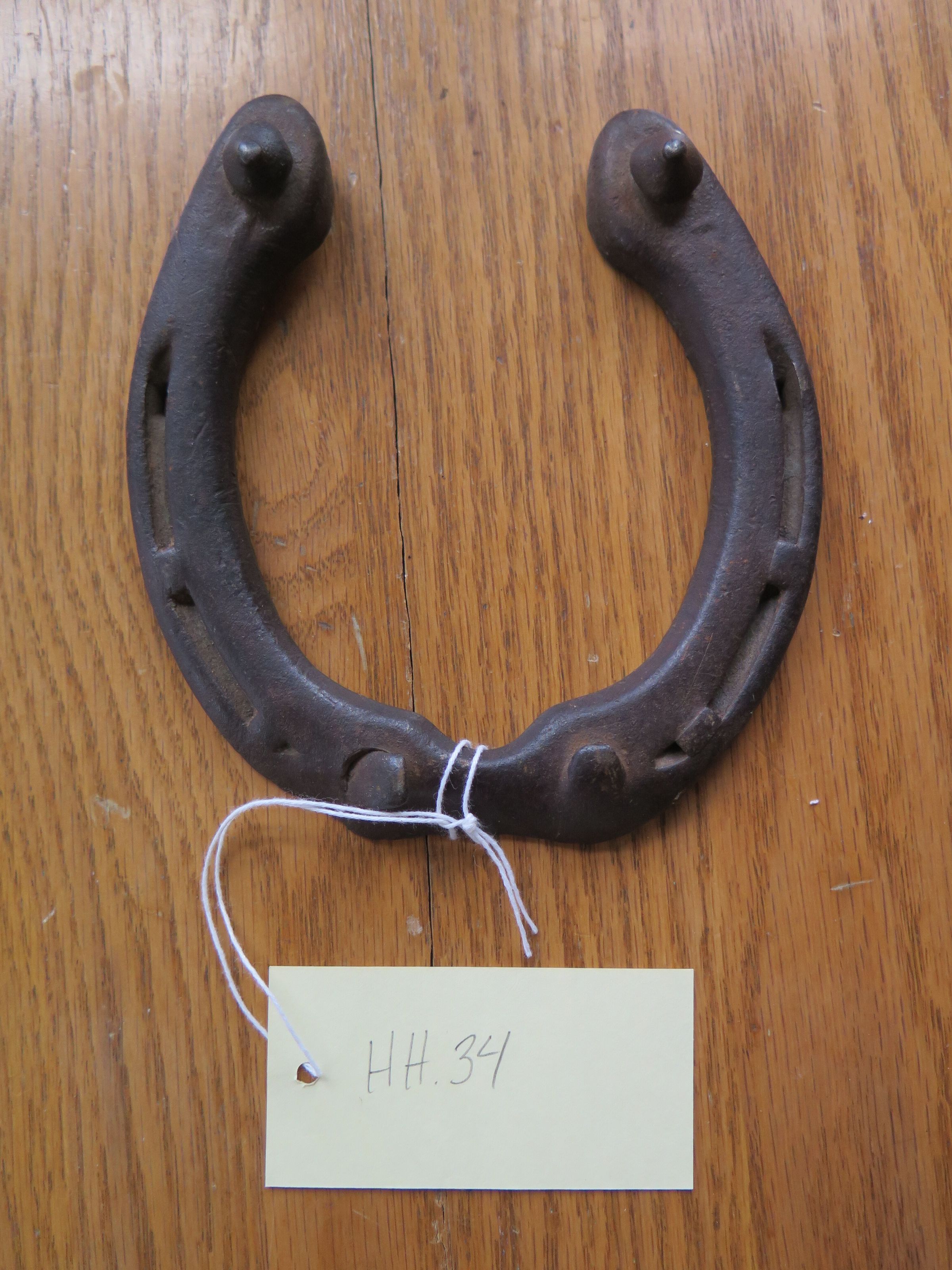 This is a metal horseshoe. There is a knob on either side of the opening of the horseshoe. The horseshoe measures 5" (w) x 6" (l).