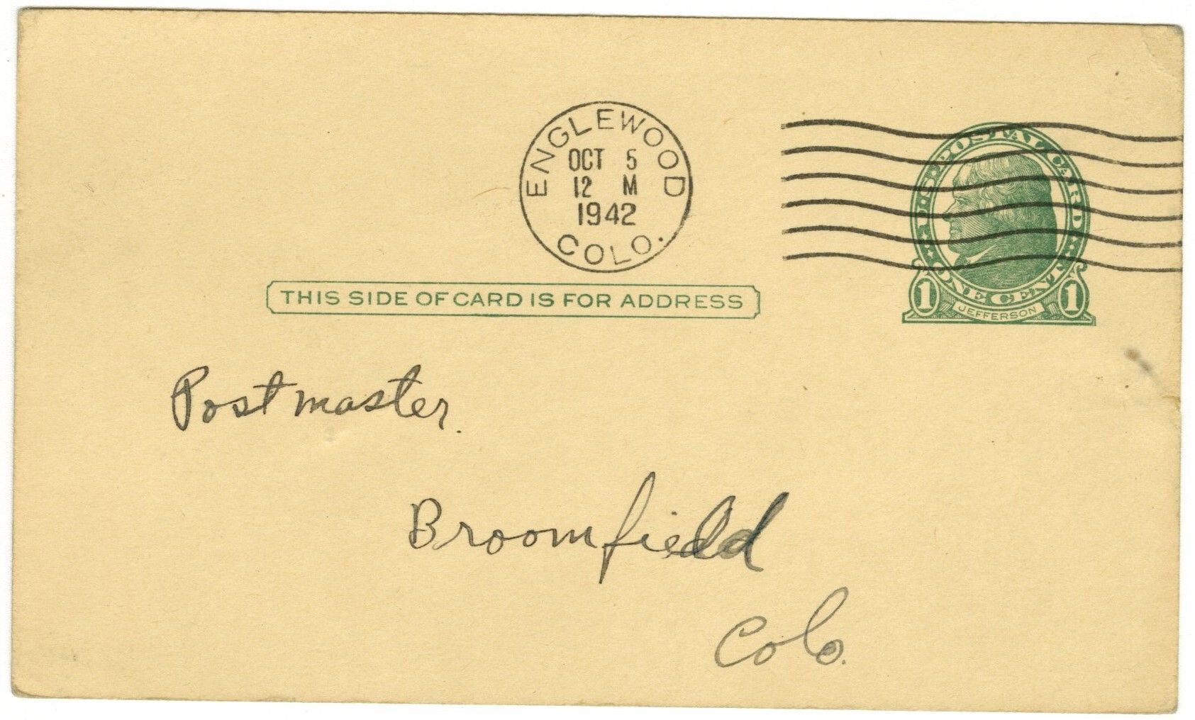 Postcard addressed to the Postmaster, Broomfield, Colo. Postage stamp green, 1c. Postal stamp from Englewood Colo. Oct 5, 1942.