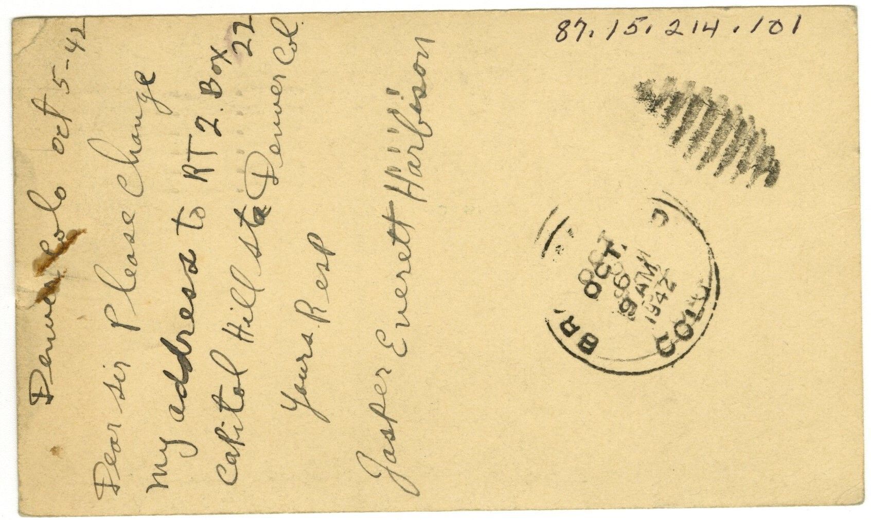On back, postal stamp from Broomfield, Colo. Oct 6, 1942. "Denver Colo oct 5-42. Dear sir, Please change my address to RT 2. Box 22. Capitol Hill St. Denver Col. Yours resp. Jasper Everett Harbison."Collection