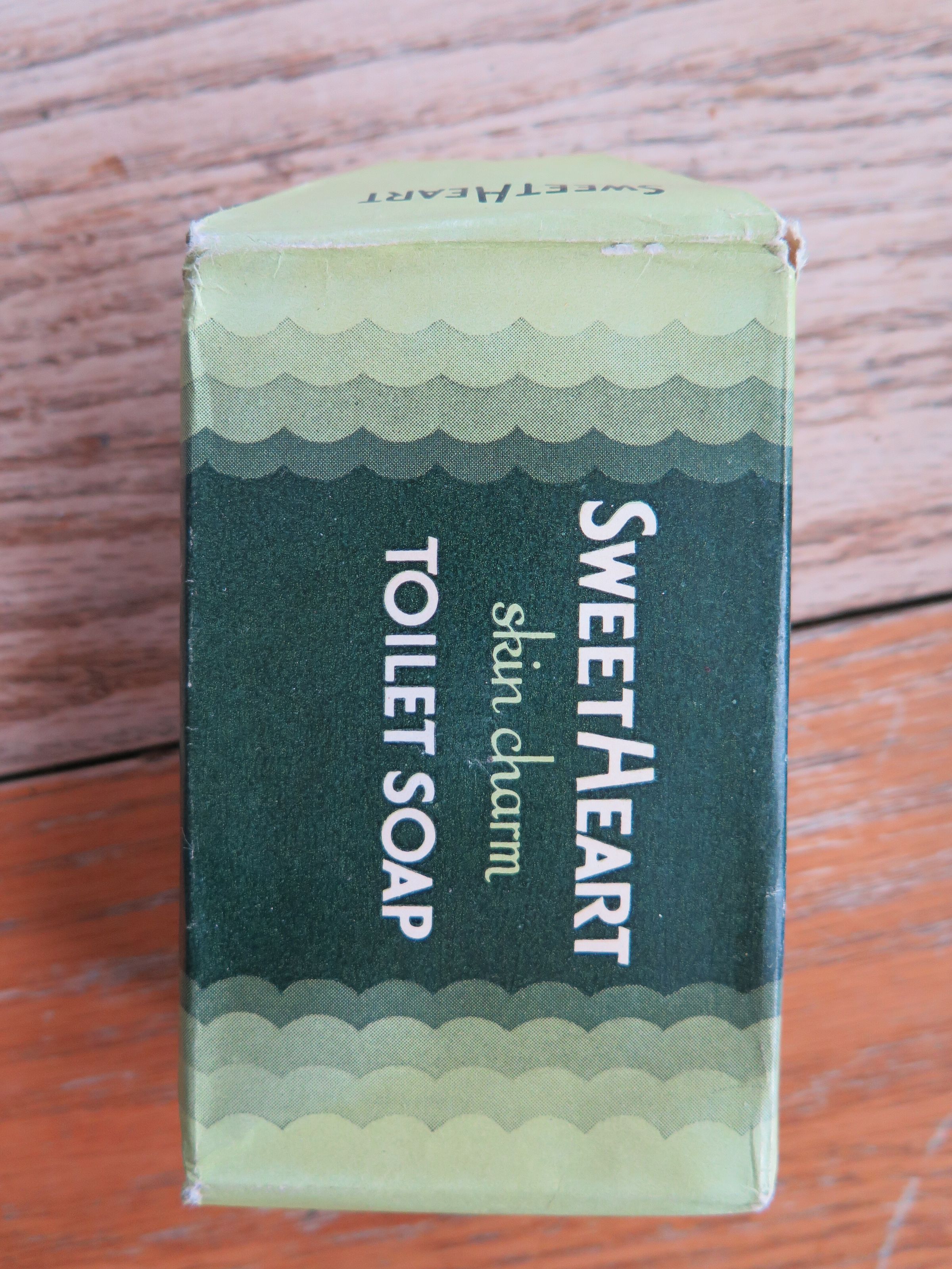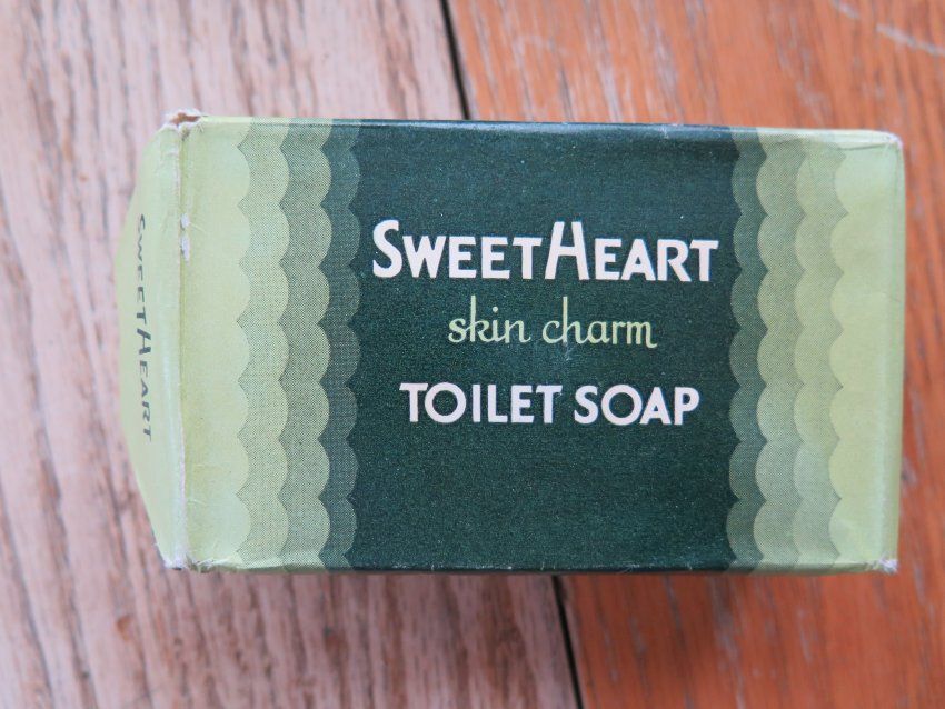 Soap wrapped in a green paper wrapper. It is "SWEETHEART" brand and has the text "skin charm / TOILET SOAP" printed on the wrapper. The soap measures 1.5" (h) x 2.5" (w) x 4" (l).