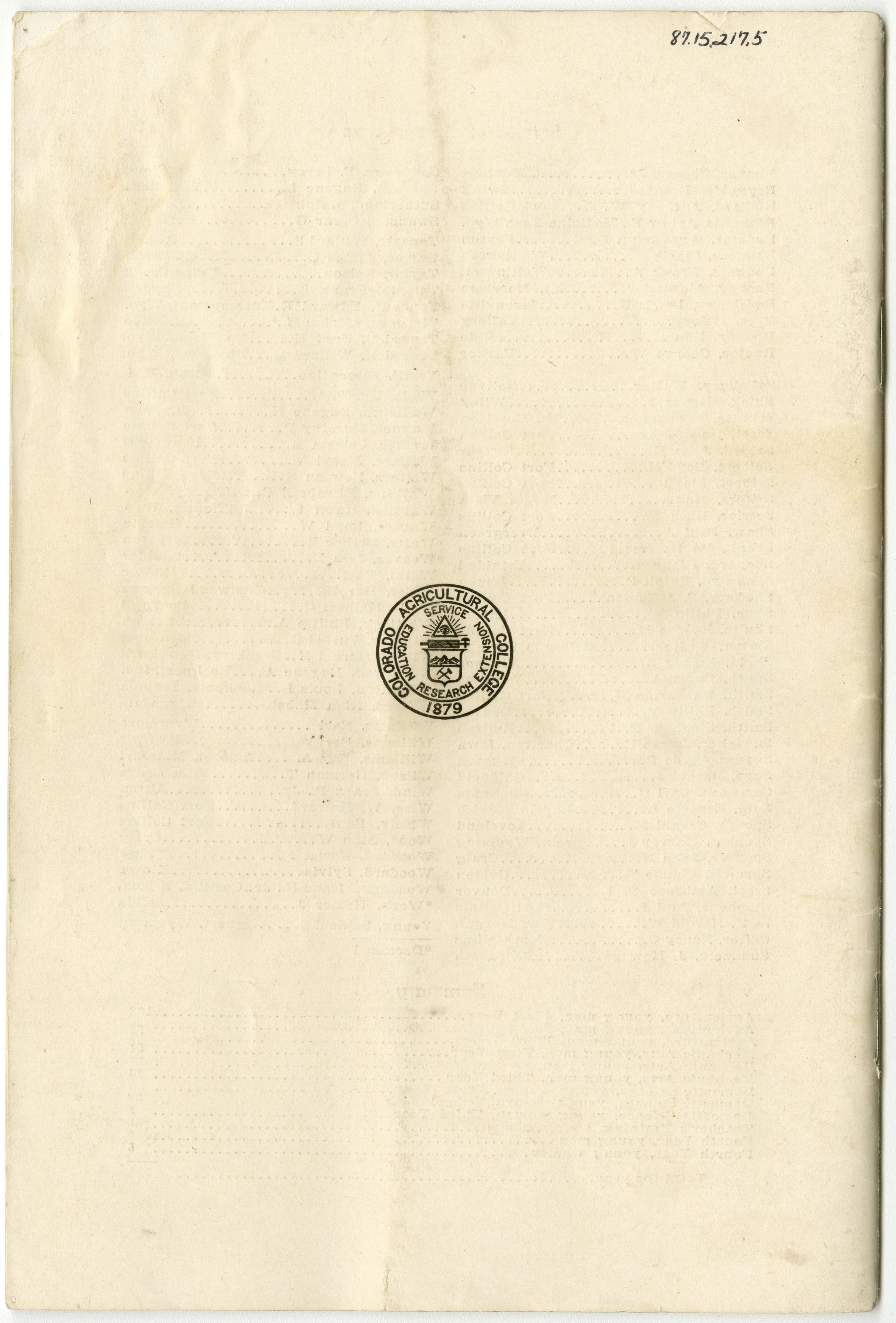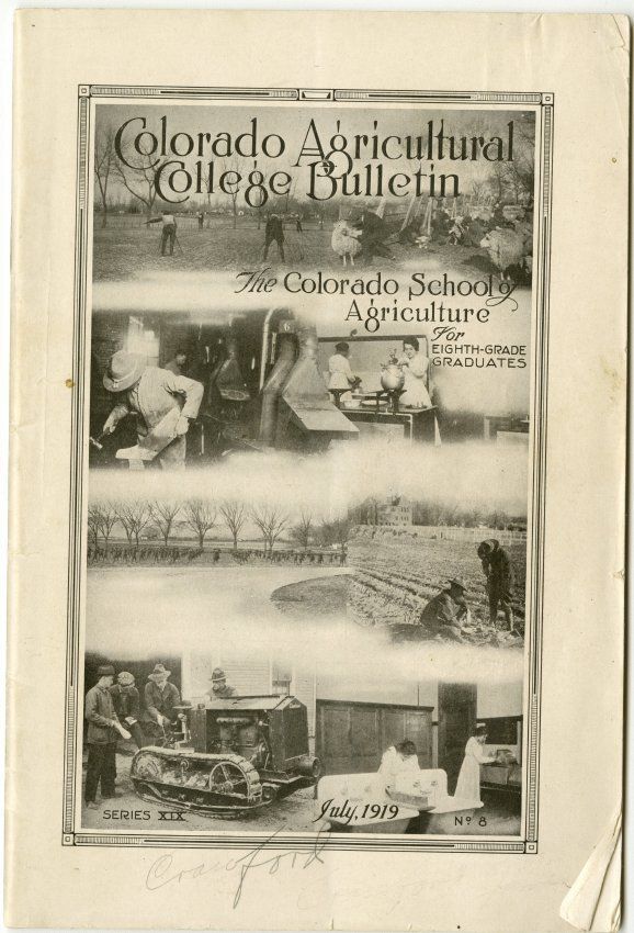 Colorado Agricultural College Bulletin. The Colorado School of Agriculture for Eigth-Grade Graduates. July 1919. "Crawford" is written at bottom of front cover. Several pages of information about the school's courses of study.