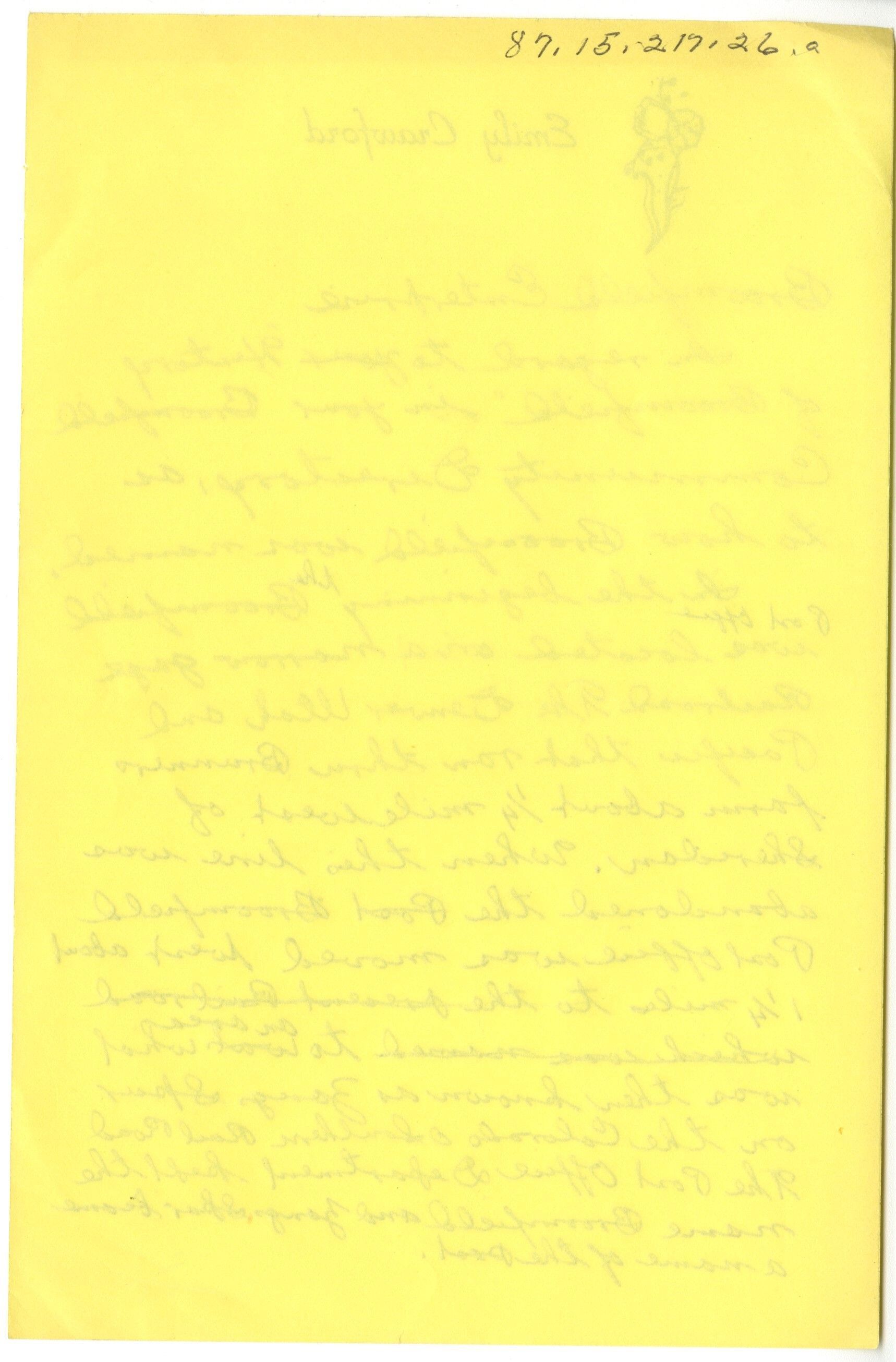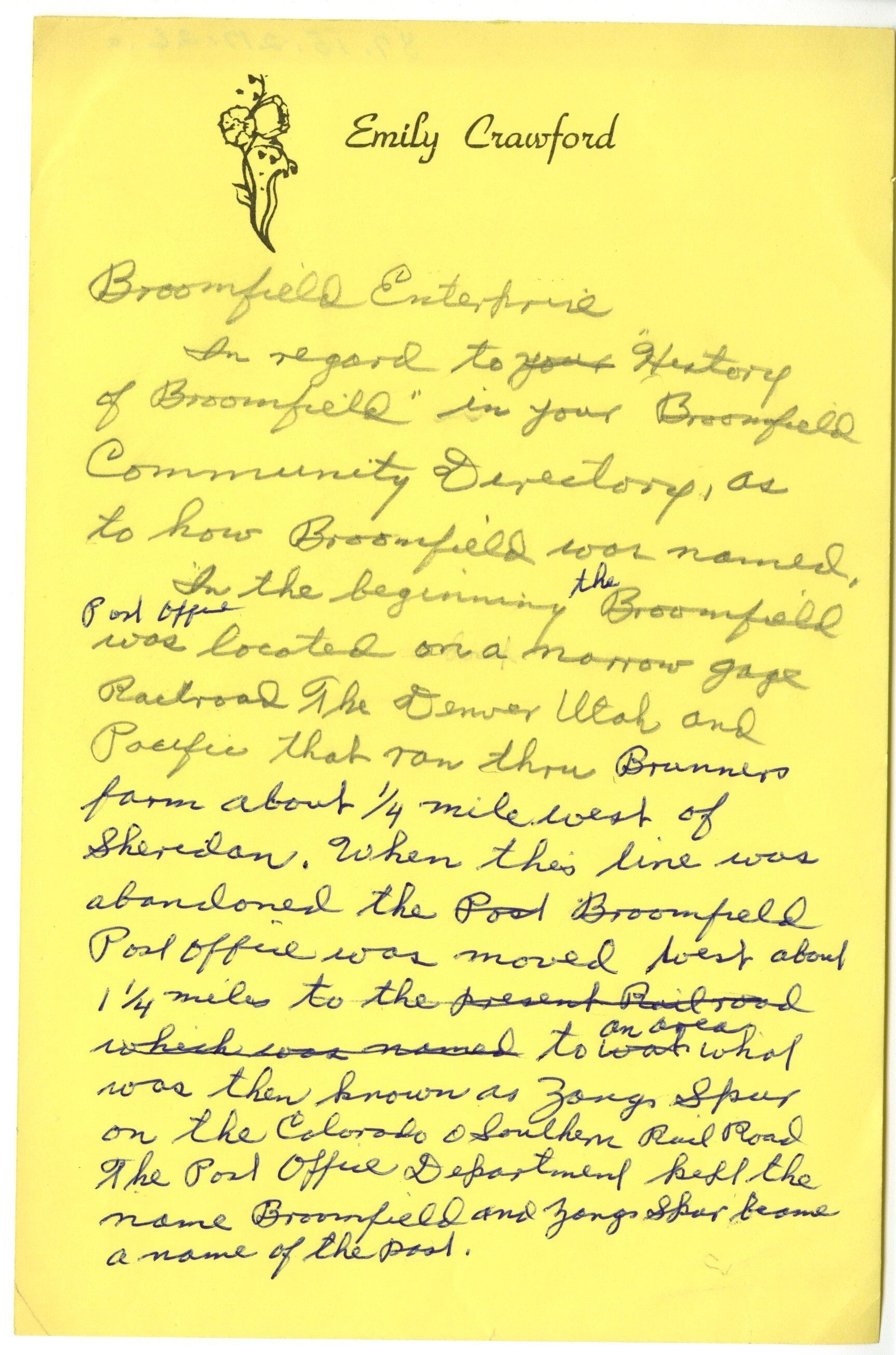 A: Yellow paper with a letterhead of flowers and the name Emily Crawford. Paper is handwritten in pencil and blue pen. Describing the creation of the name Broomfield.