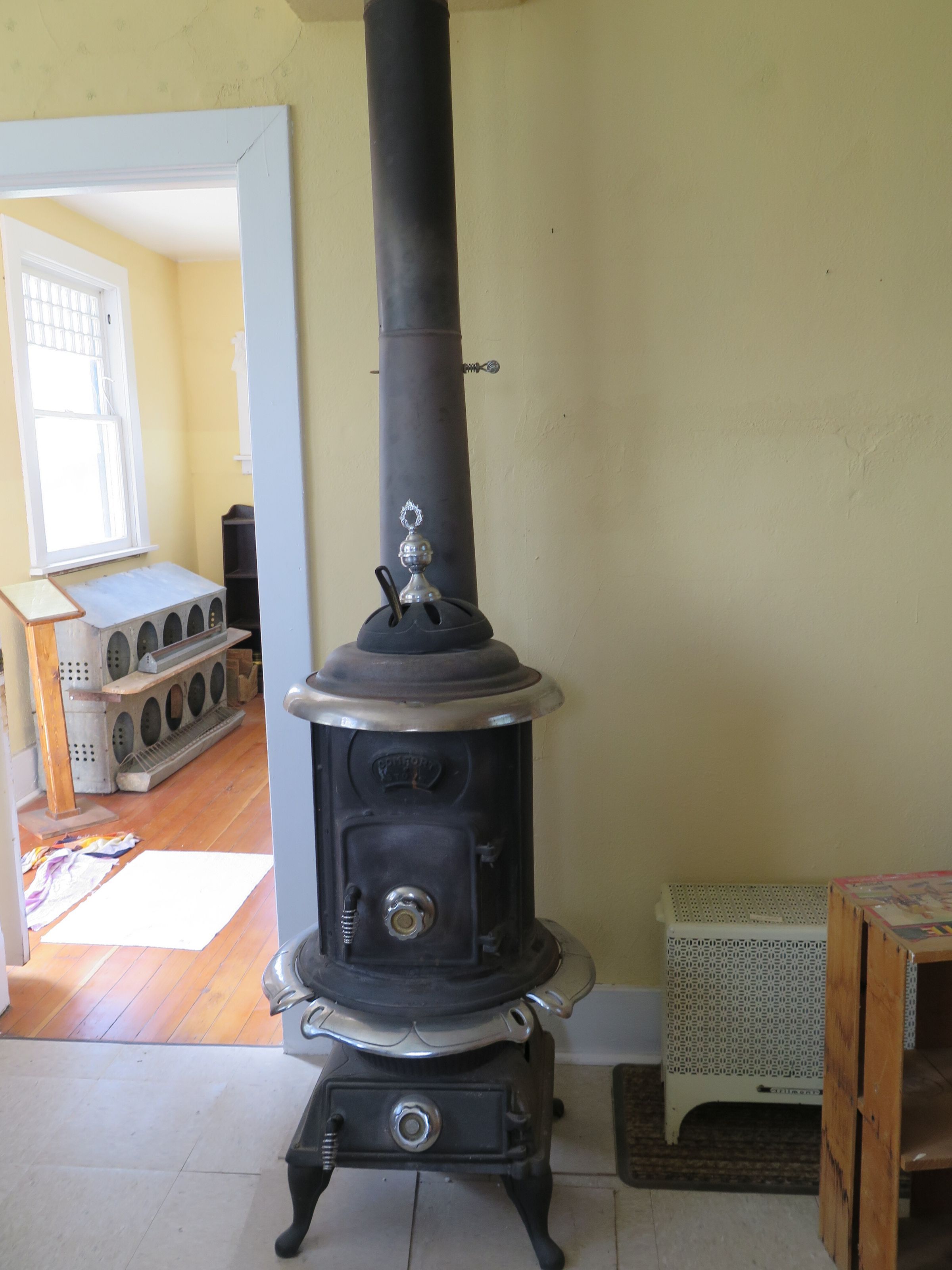Cast iron wood stove used to heat a building. There is text on the front of the stove that reads "COMFORT / STOVE." There is a compartment on the bottom with a handle to remove the ashes. The stove has four legs. The stove measures 53" (h) x 22" (diam).