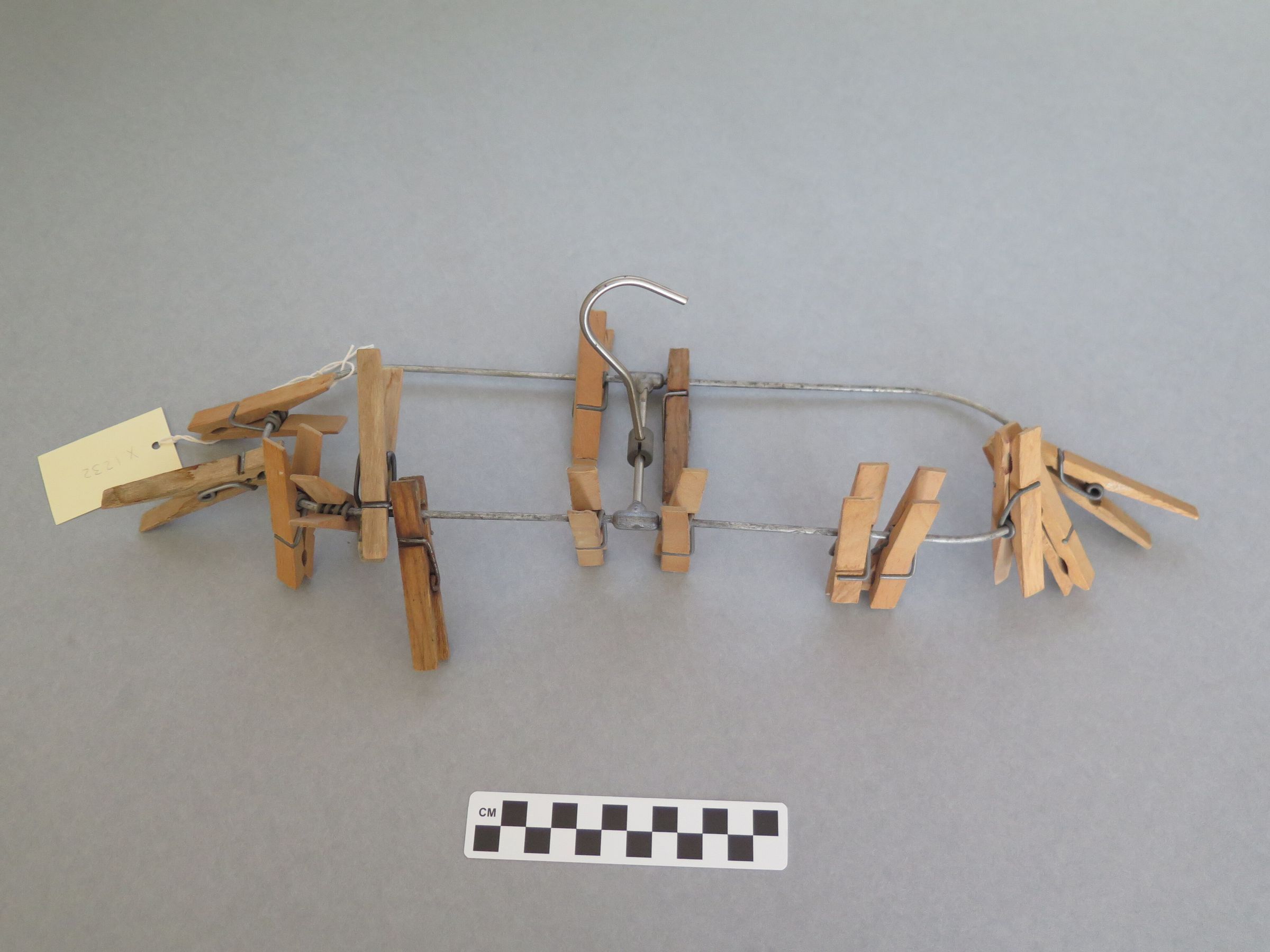This is a drying rack made from a metal oblong loop with a cross-bar in the middle. There is a hanger attached to the cross bar. There are 15 clothespins attached to the loop. The drying rack measures 3.5" (h) x 4" (w) x 13.5" (l).