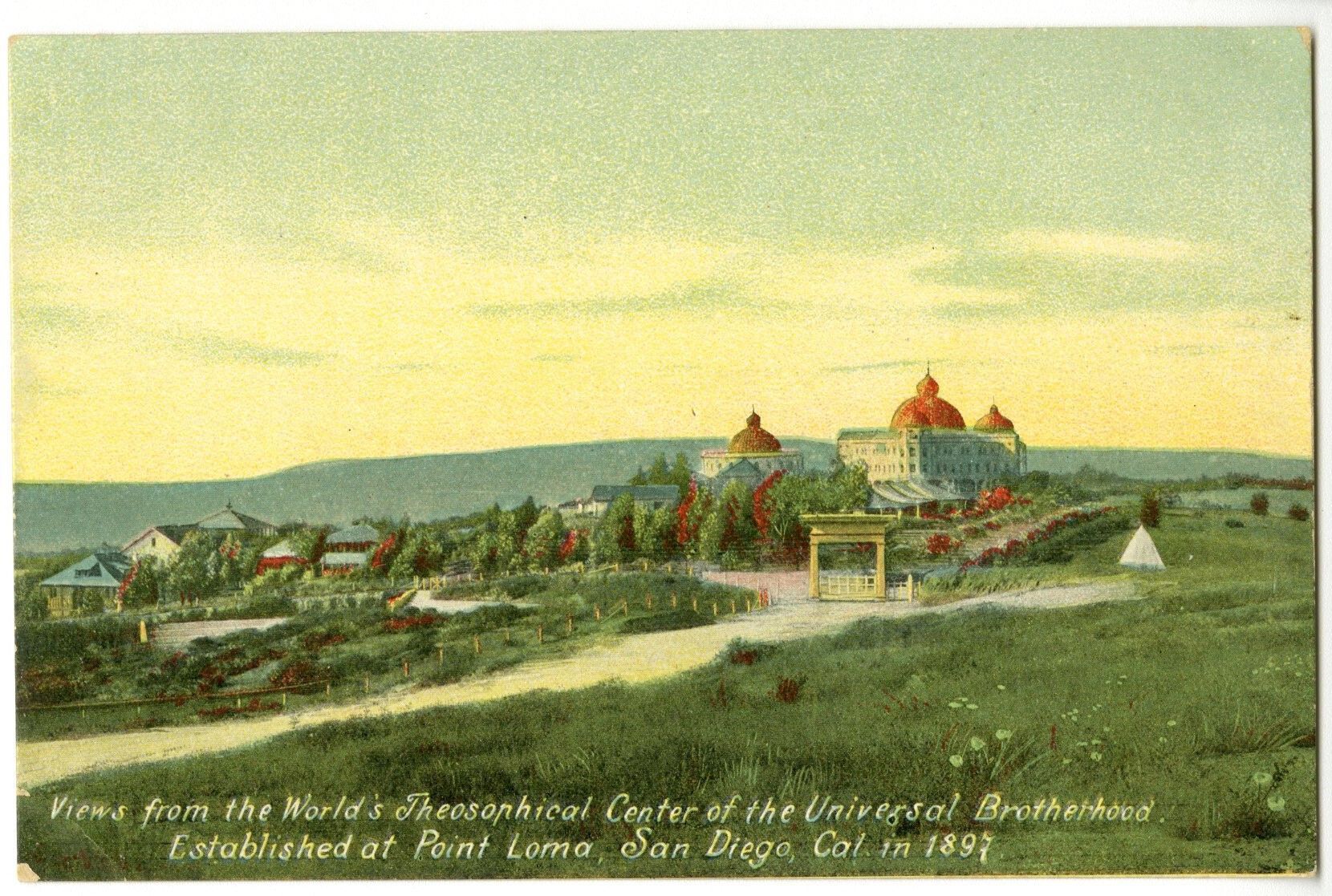 Blank postcard with "Views from the World's Theosophical Center of the Universal Brotherhood. Established at Point Loma, San Diego, Cal. in 1897." Depicting a red-roofed building on a green field, with yellow and blue sky.Collection
