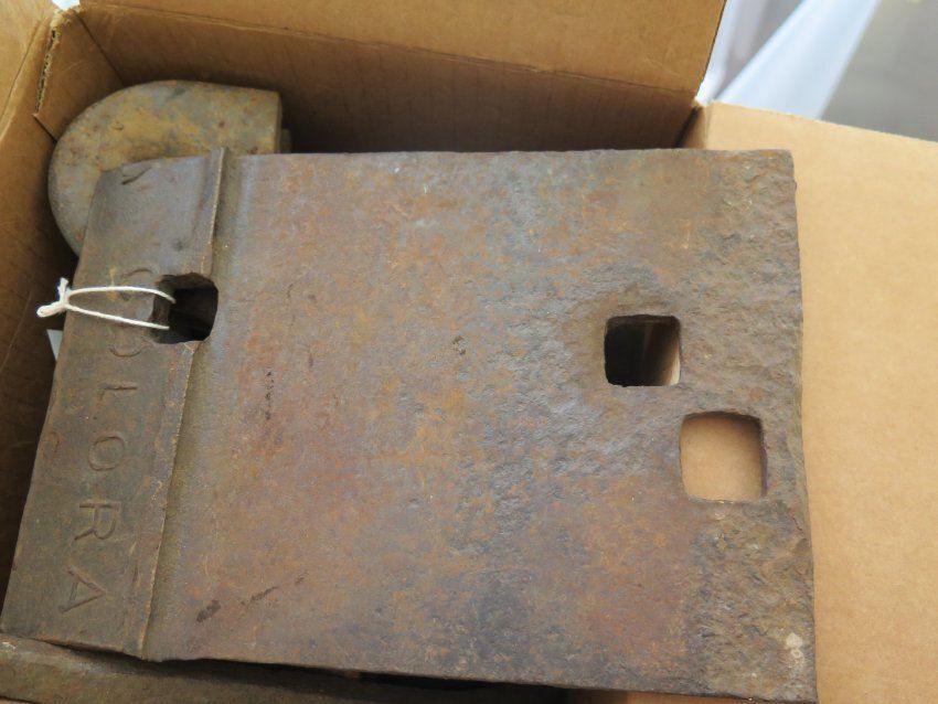 This is an iron rail tie plate. It has "COLORA" embossed on it. There are 3 holes where spikes could be placed. The plate measures 5.75" (w) x 8.5" (l).