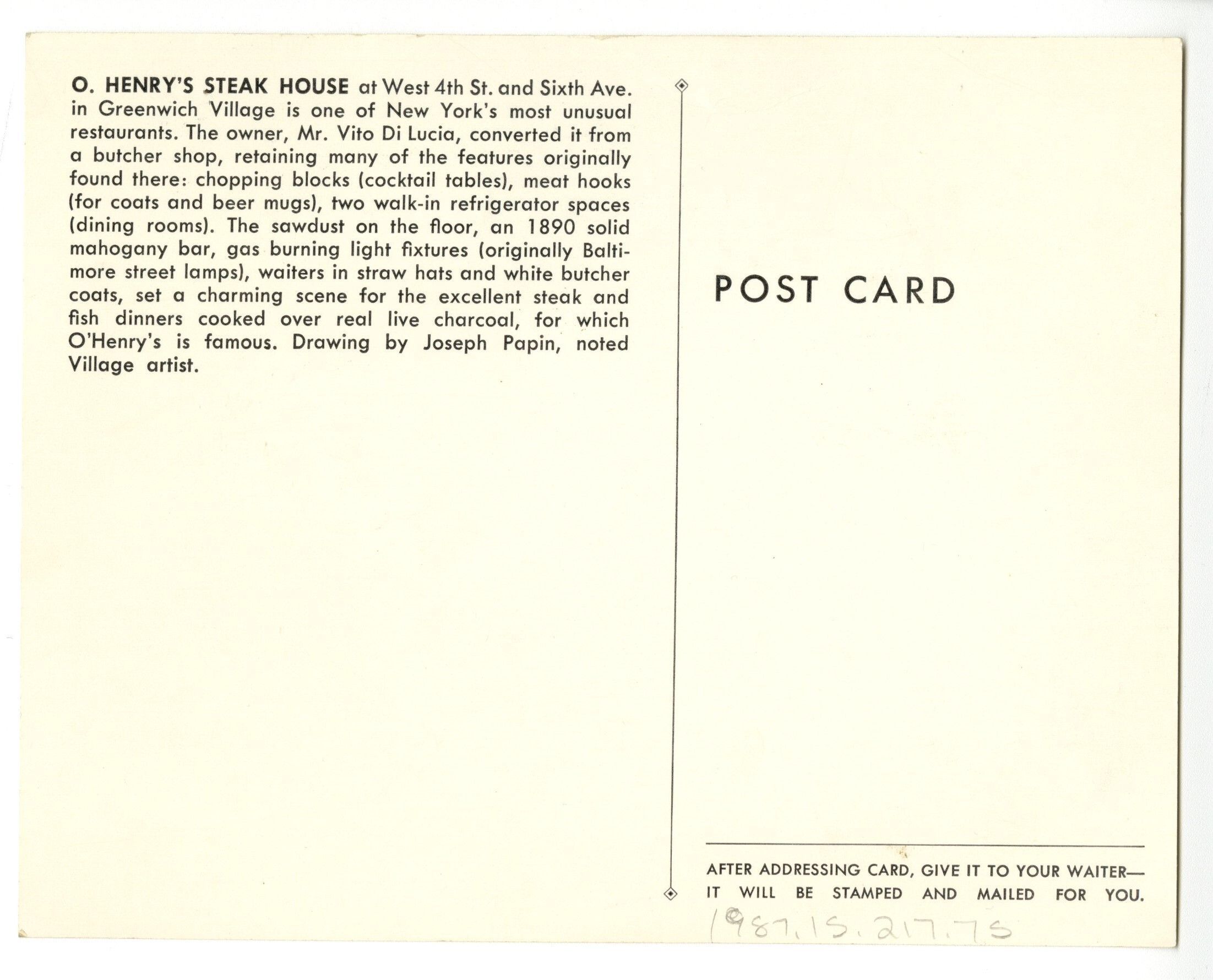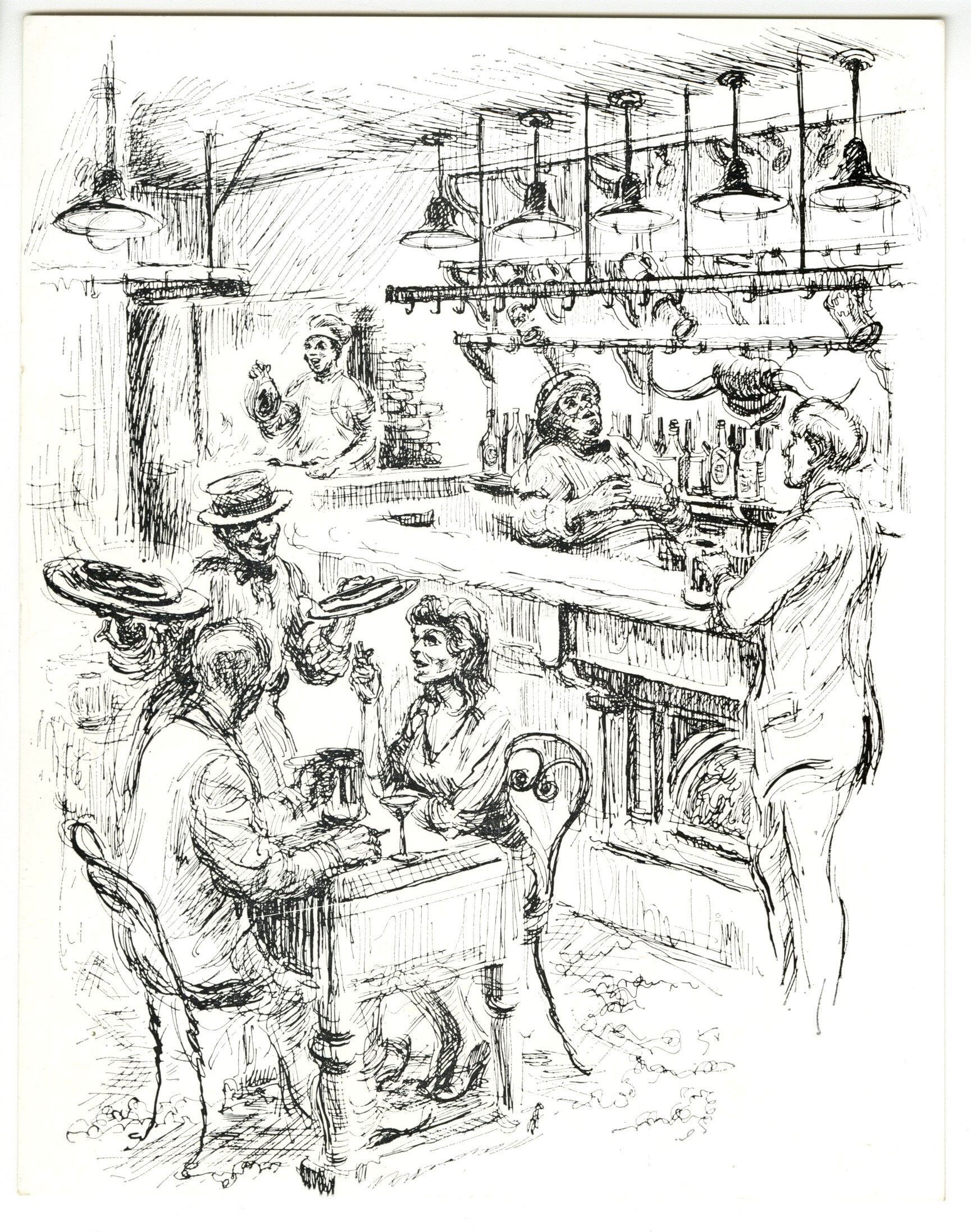Blank postcard, black and white illustration of O. Henry's Steak House depicting two people seated at a table, one behind a bar, and three others standing.Collection