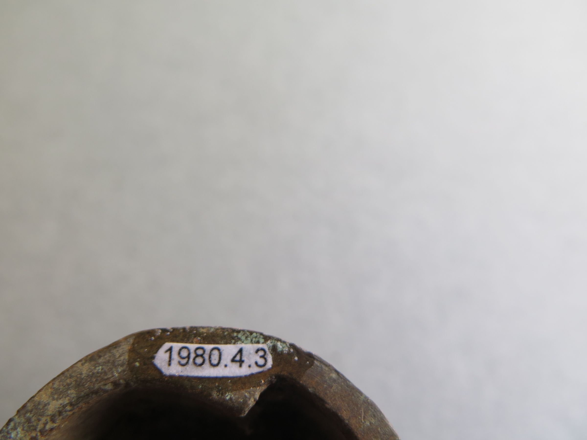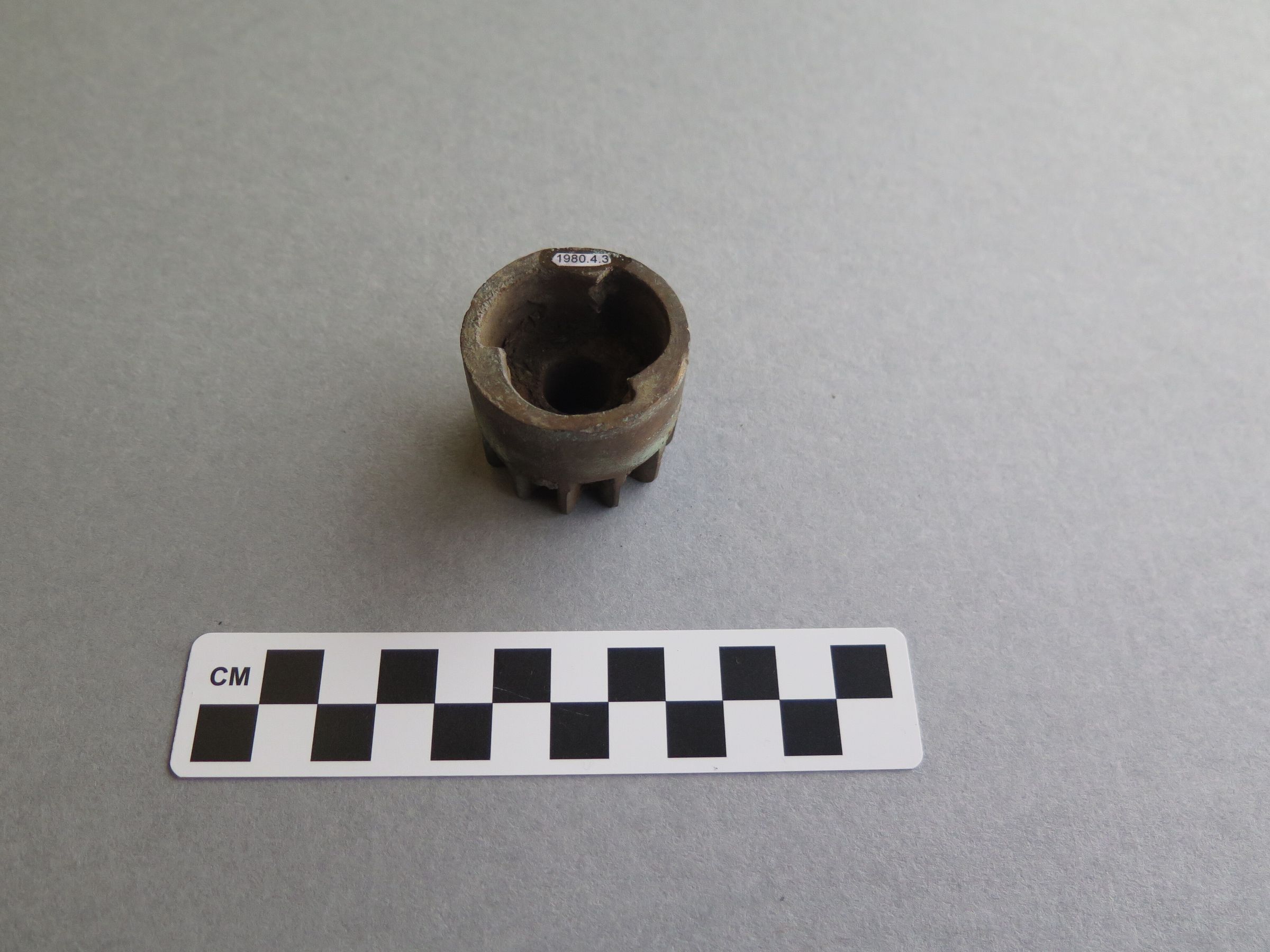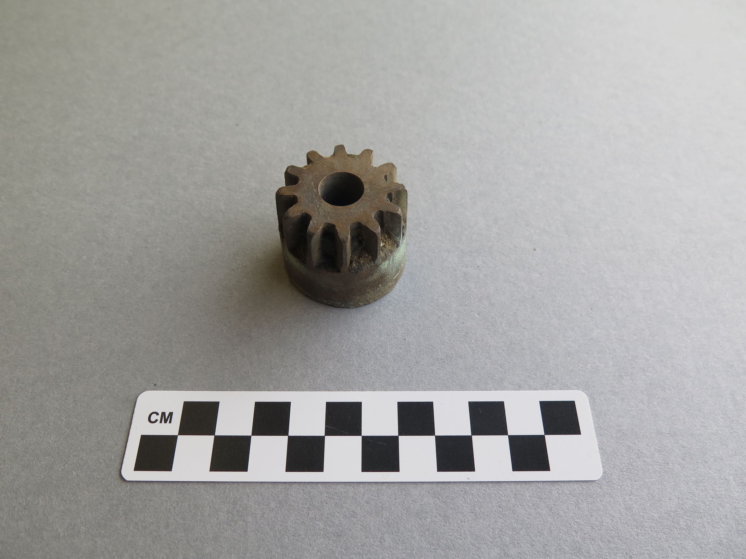 This is a bronze cog that is part of a larger machine. It is round in shape with one side that has 12 gear projections and the other side is smooth but on the interior has three indentations and each has two grooves on the edge. There is a round hole through the center. The fragment measures 3" (h) x 3.75" (diam) with a 1 cm hole in the center.Collection