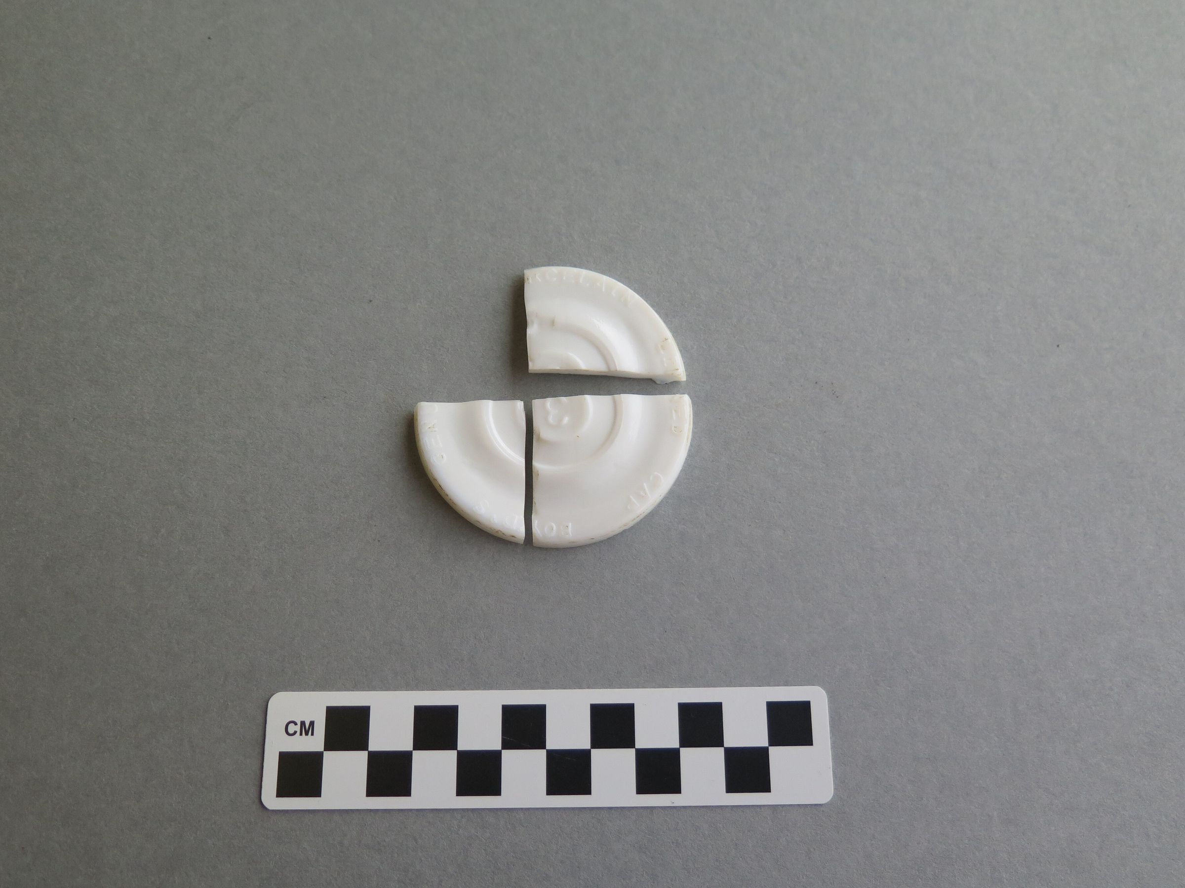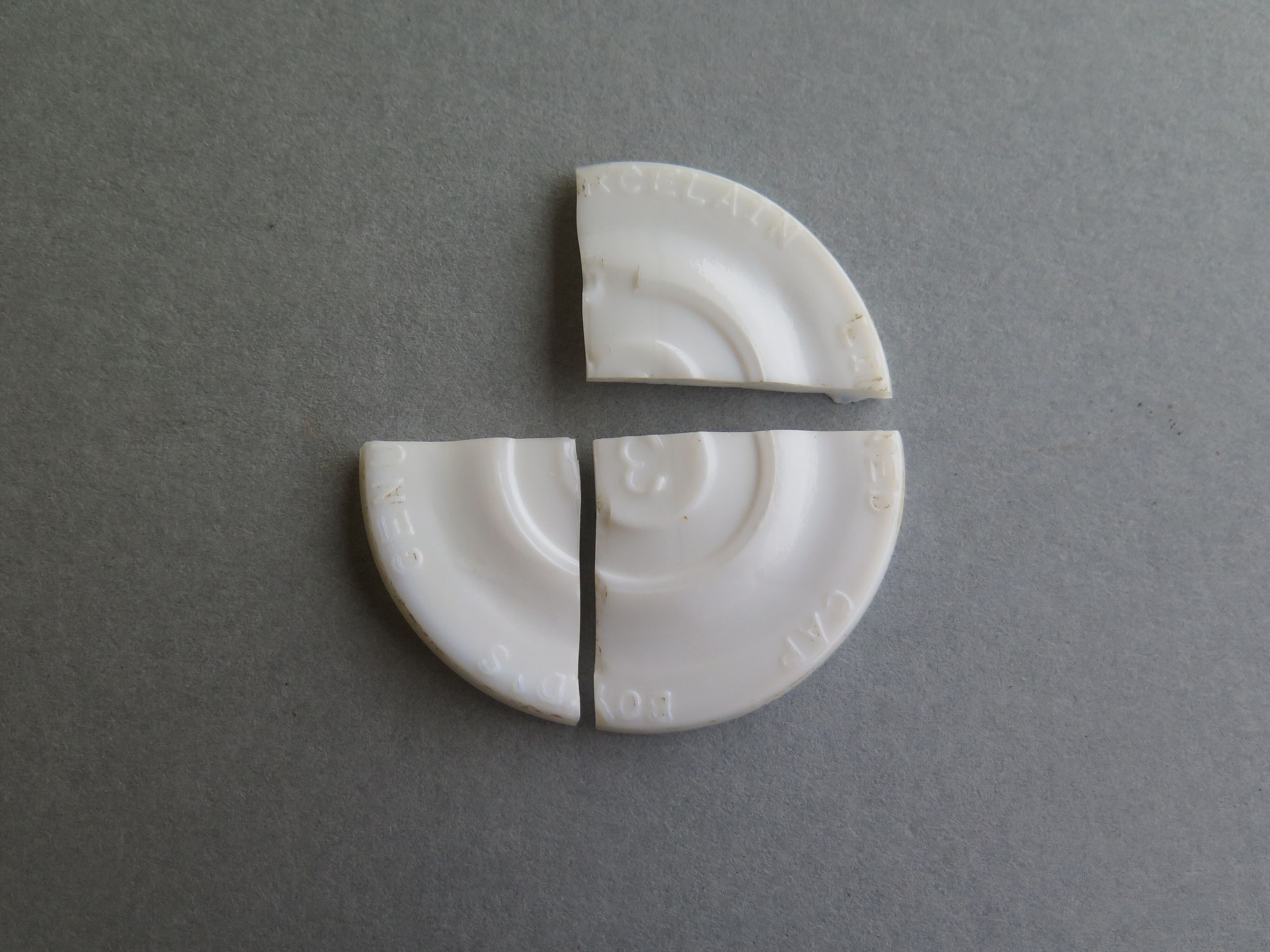 White/ milk glass jar lid liner. Around the outside edge in raised letters " _ RCELAIN LINED CAP BOYD'S GENU_." In the center is "3." There are two raised rings and one depression from the center outward. On the back side is a raised ring near the outer edge. The lid liner measures .5" (h) x 6.5" (diam).Collection
