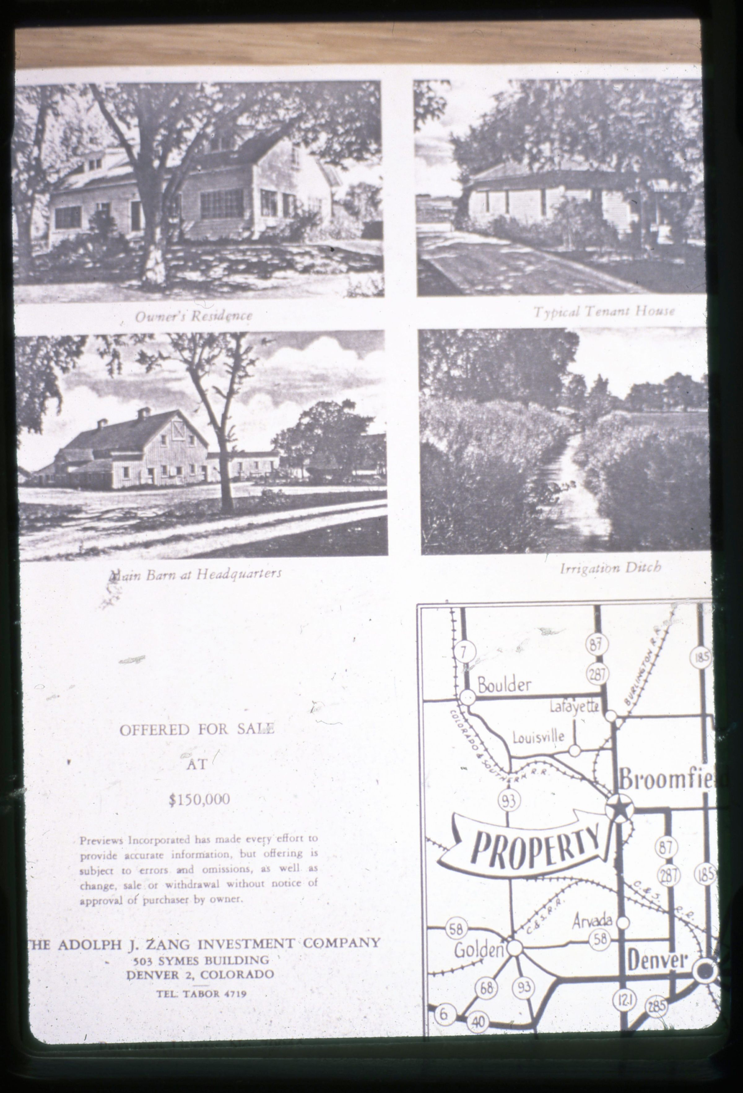 A film slide of the Elmwood Ranch sale brochure's back side with 6 black and white photos. 3 of them are different buildings on the ranch, one of them is a irrigation ditch, a offered for sale information with the company name and address, and the last photo is a map of where the ranch is.