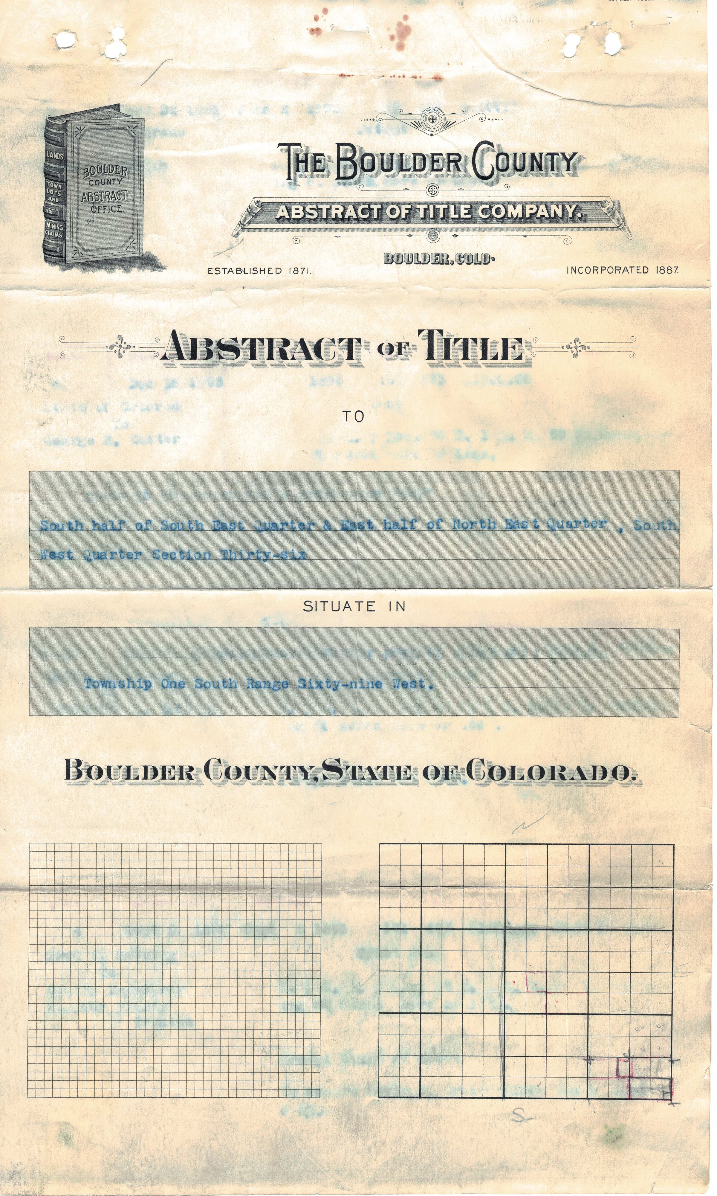 Abstract of title from the Boulder County Abstract title Company for property that became the Brunner Farm (at the house's original location along 120th). Digital file only, PDF. Original document remains with Brunner family. Document outlines the history of the property from its first sale in 1893 (from the State of Colorado to Lewis E. Craine) until 1946 when the property transferred from Albert Brunner to his son Lester C. Brunner. Albert had purchased the land from his in-laws, listed here as Fred Berges. The land, or parcels of the original homestead, changes hands multiple times. Both Harry Brown and John Crooks owned parts of the land at some point, among others. Includes map of Boulder County homesteads per the Homestead Act. The area is described as follows, "South half of south East Quarter and East half of North East Quarter, South West Quarter Section Thirty-six" in "Township One South Range Sixty-nine West".Collection