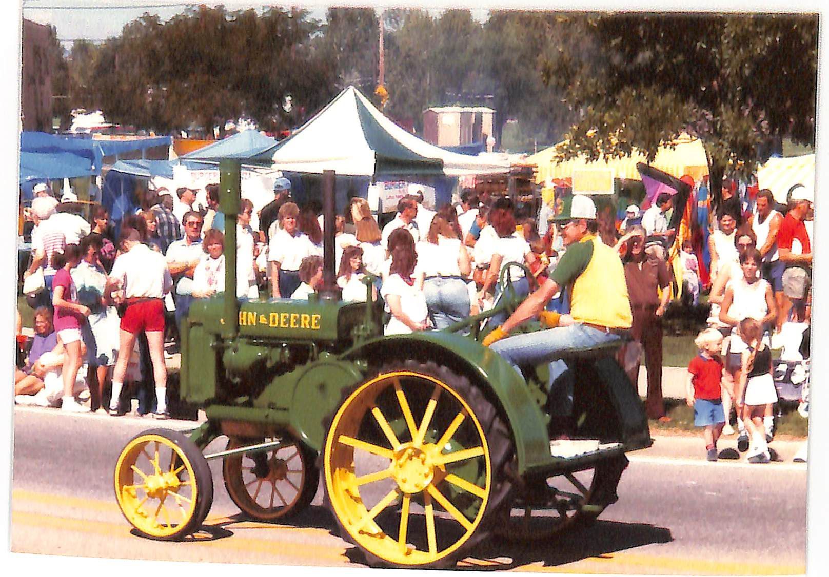 Item is a photograph printed on Kodak paper taken during the 1989 Broomfield Days event. The photo centers around the street, where a green John Deere tractor with yellow wheels is part of the parade. A man in a yellow shirt and green hat is driving the vehicle, and crowds are gathered at the street's edge to watch. Multicolored tents hosting other festivities are present amongst the trees in the background.Photograph Details