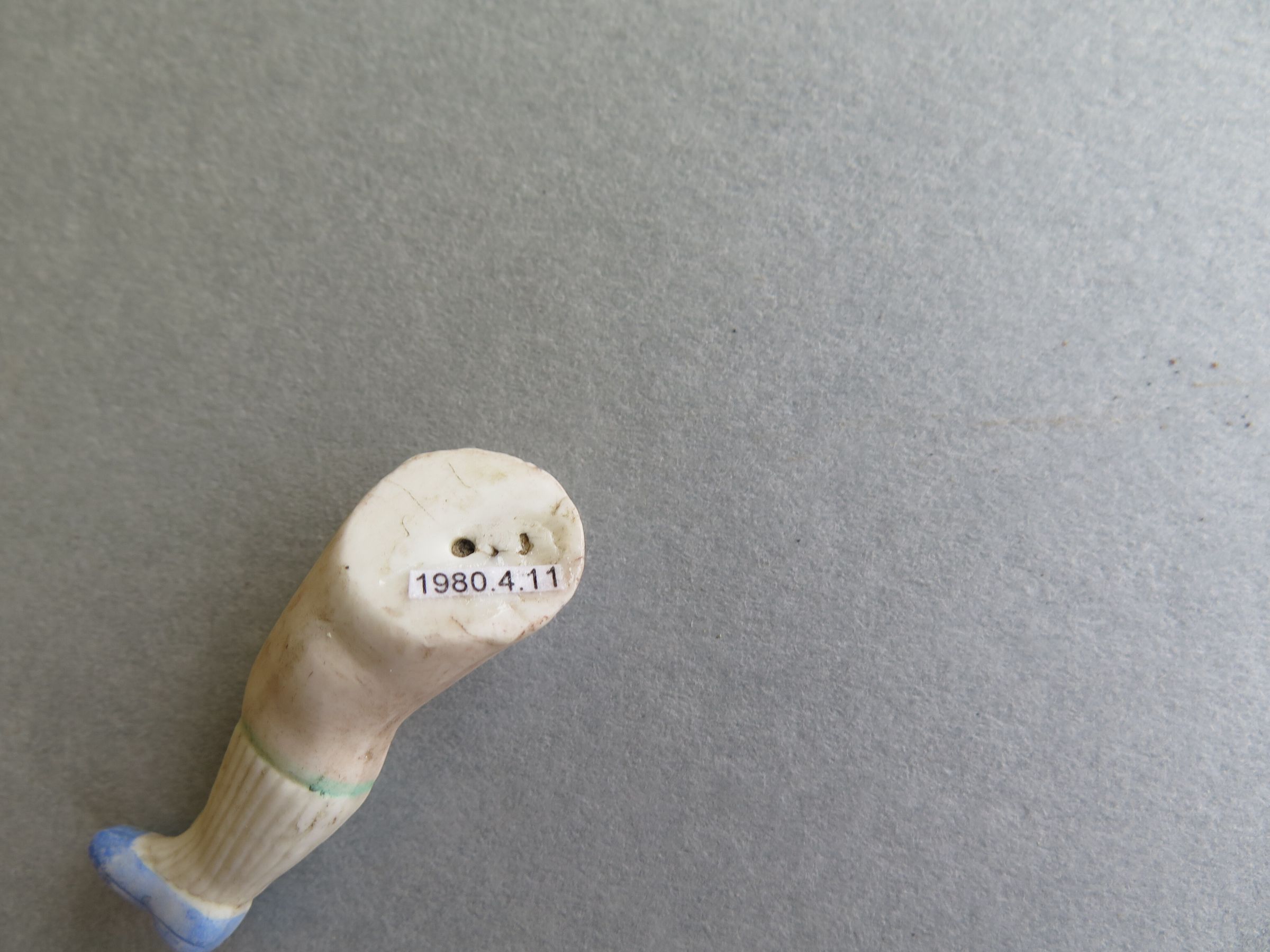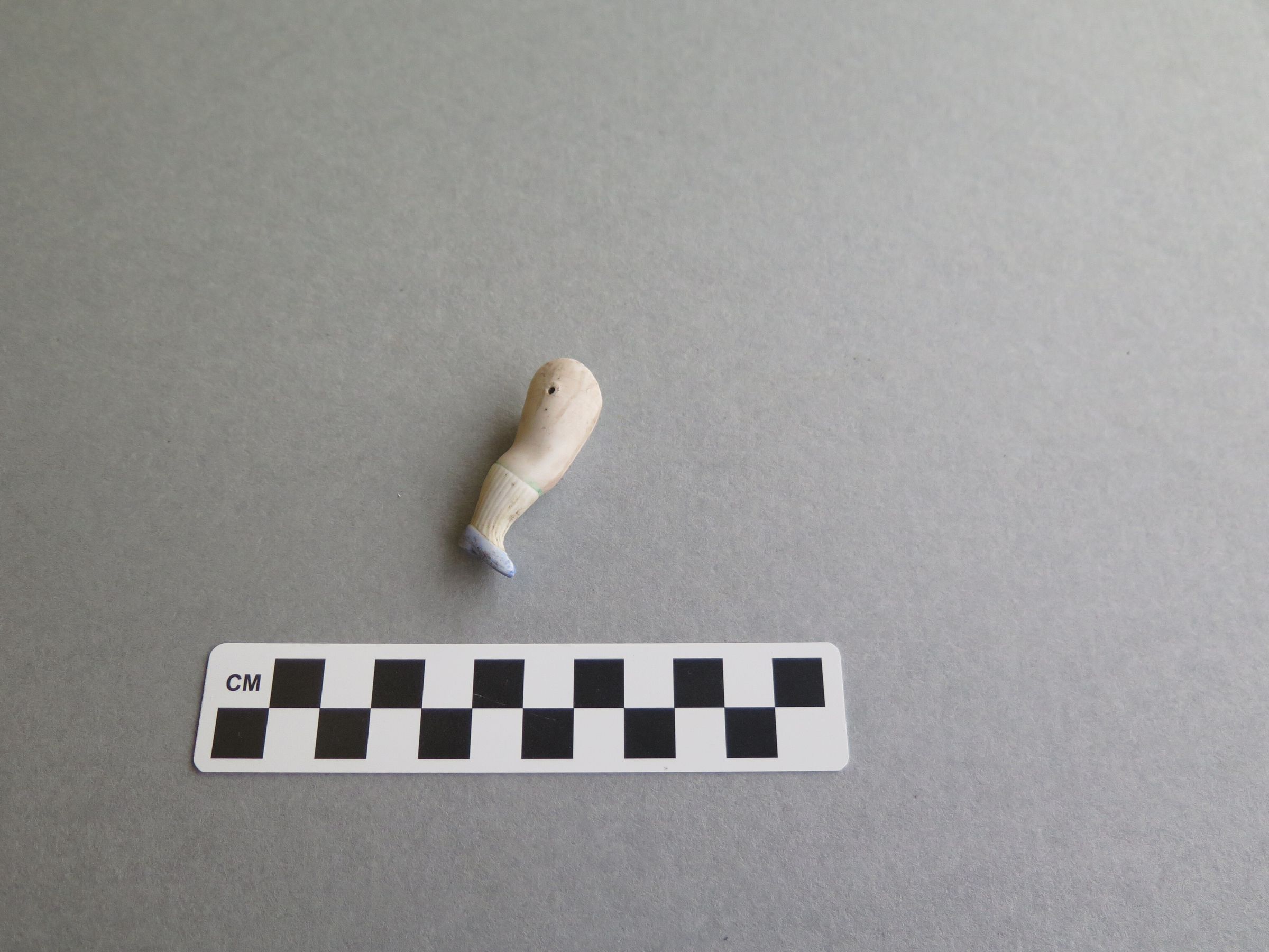 This is an unglazed porcelain right doll leg. The leg has a blue healed shoe, white socks, and green garter. The leg extends to the hip with an angled joint. There is a hole through the leg for attaching to the doll. The doll leg measures 1" (h) x 1.5" (w) x 4.5" (l).Collection