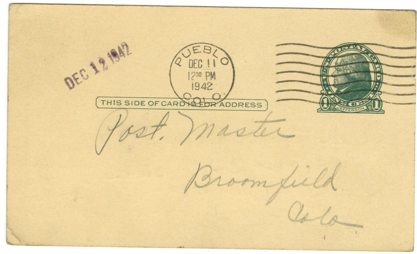 Postcard addressed to the Postmaster, Broomfield, Colo. Postage stamp, green, 1c. Postal stamp from Pueblo Colo, Dec 11, 1942. Date stamp: Dec 12, 1942.