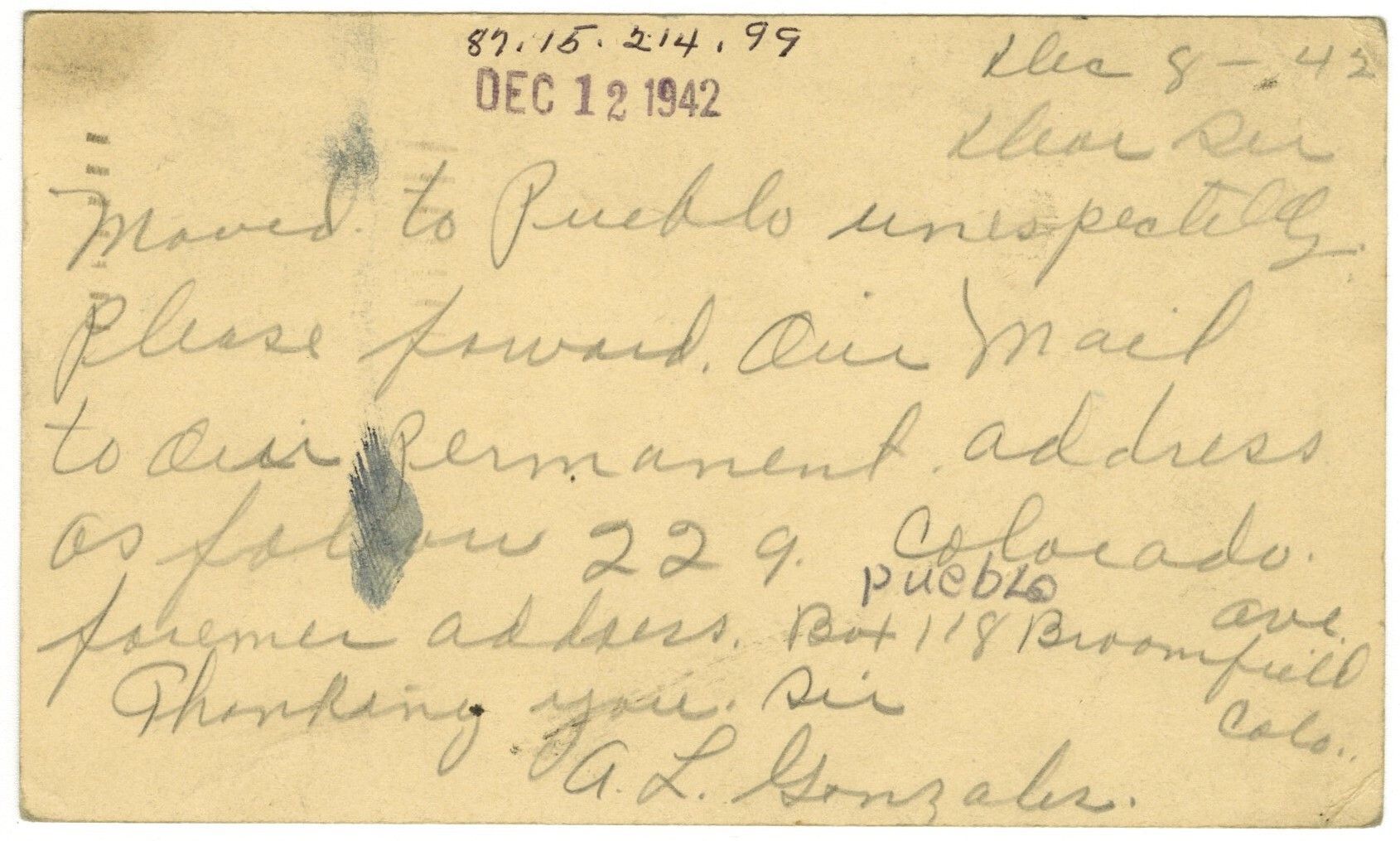 On back, Dec-8-42. "Dear Sir, Moved to Pueblo unespecitally. Please forward our mail to our permanent address as Folsom 229. Pueblo Colorado Ave. Former address, Box 118 Broomfield Colorado. Thanking you sir, A. L. Gonzales." Stamp: Dec 12, 1942.Collection
