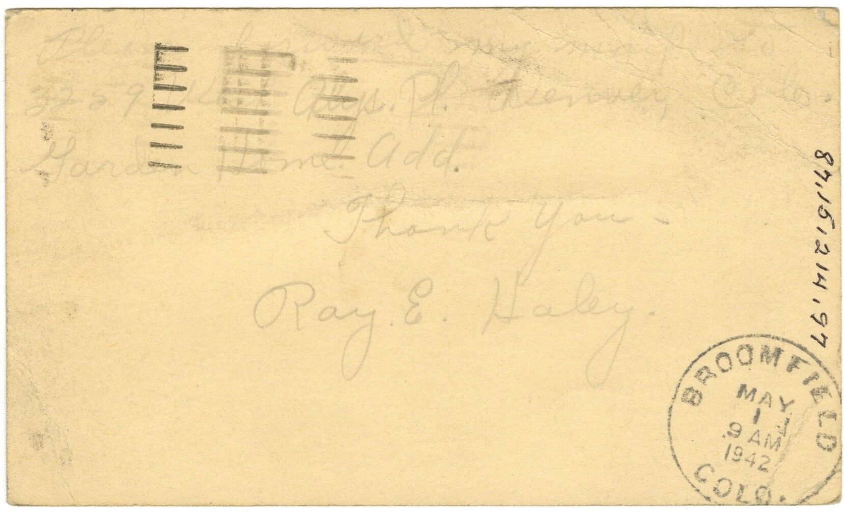 On back, postal stamp from Broomfield Colo, May 1, 1942. "Please forward any mail to 3259 West Alys Pl. Denver, Colo. Garden Home. Add. Thank you- Ray. E. Haley."Collection
