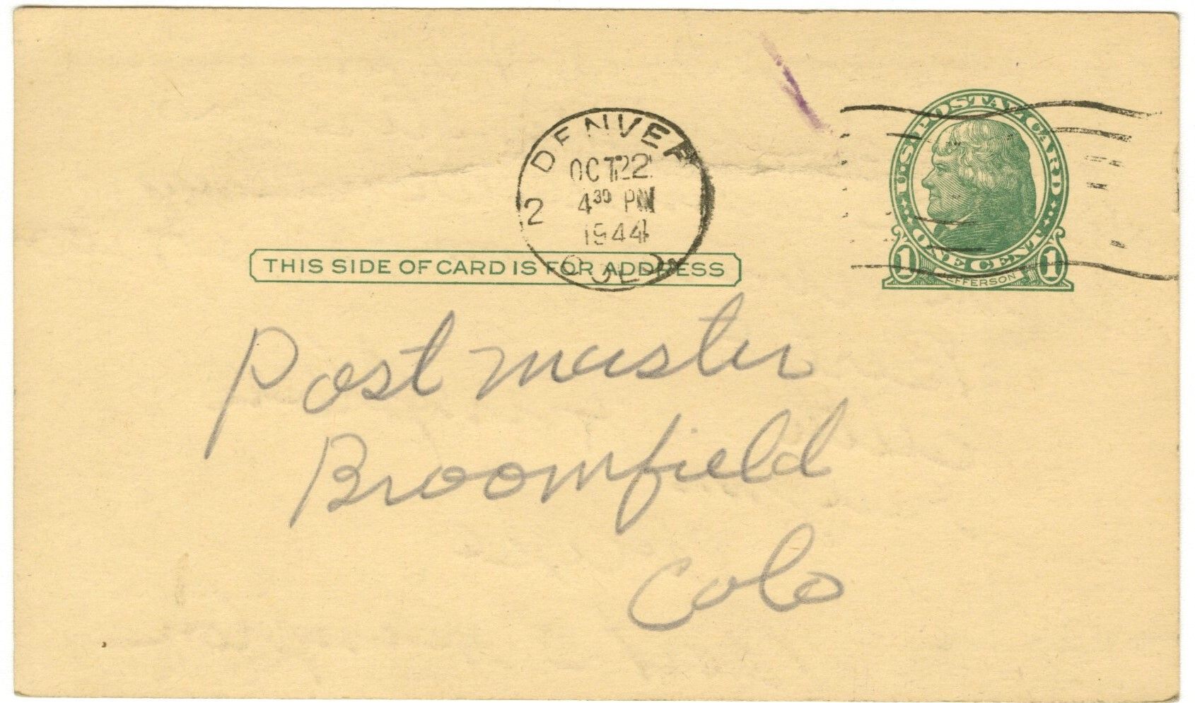 Addressed to Postmaster, Broomfield Colo. Postage stamp, green, 1c. Postal stamp from Denver, Colo. Oct 22, 1944.