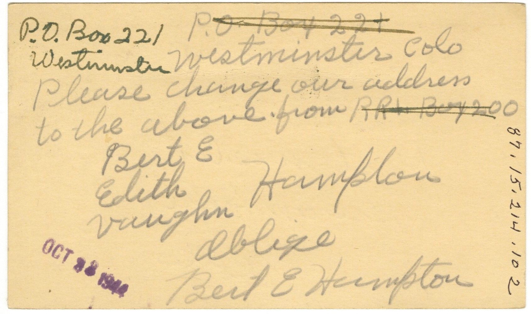 On back, "P.O. Box 221, Westminster. Please change our address to the above from RR+Box 200. Bert E, Edith, Vaughn Hampton. Oblige, Bert E Hampton." Including a stamp oct 28, 1944.Collection