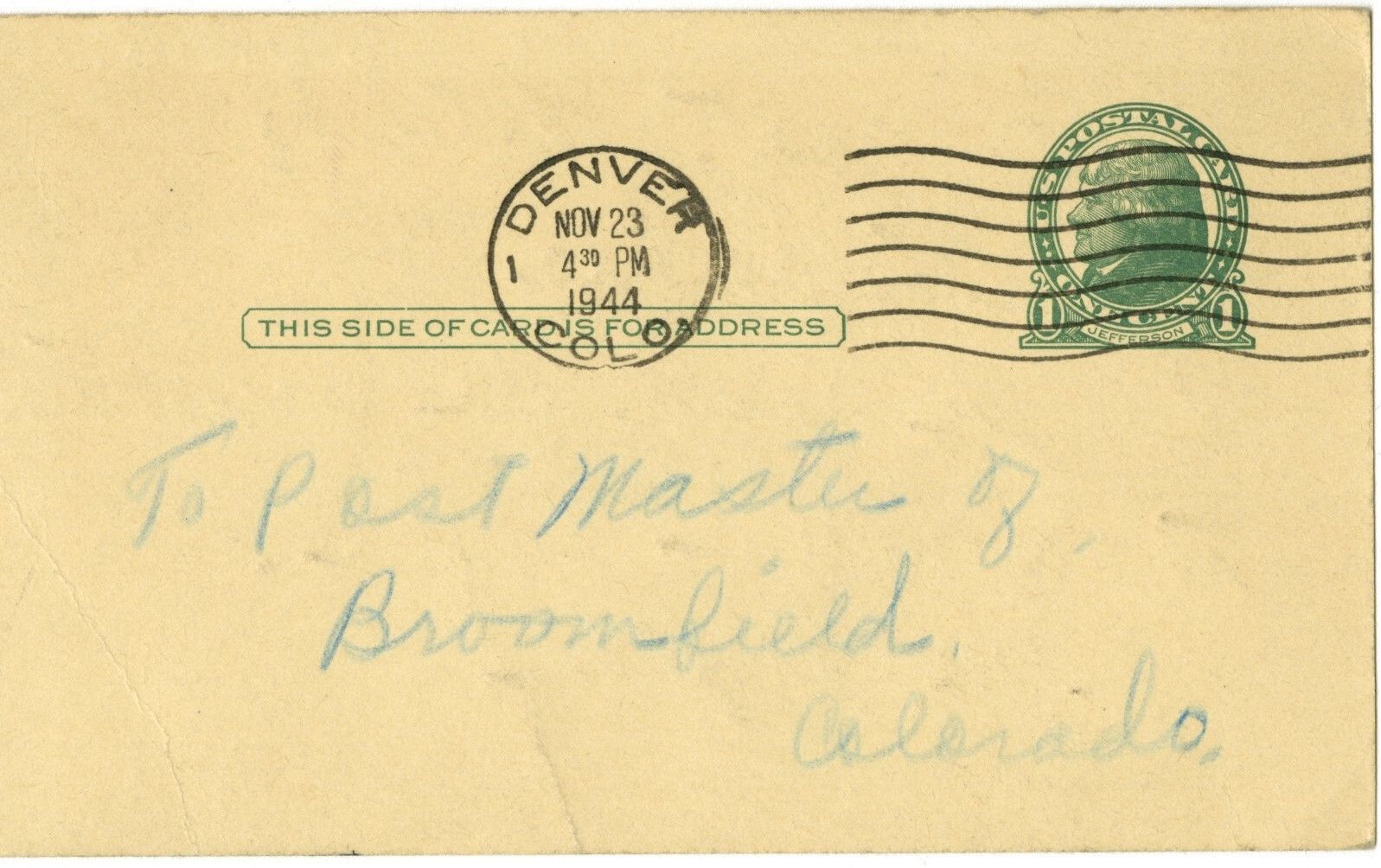Postcard addressed to Postmaster of Broomfield, Colorado. Postage stamp, green, 1c. Postal stamp from Denver, Colo. Nov 23-1944.
