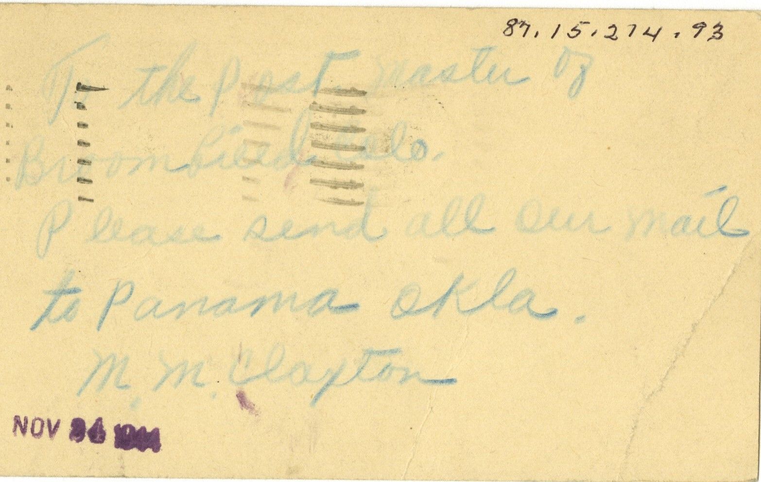 On back: "To the Postmaster of Broomfield, Colo. Please send all our mail to Panama Okla. M. M. Claxton." Also purple stamp "Nov 24, 1944."Collection