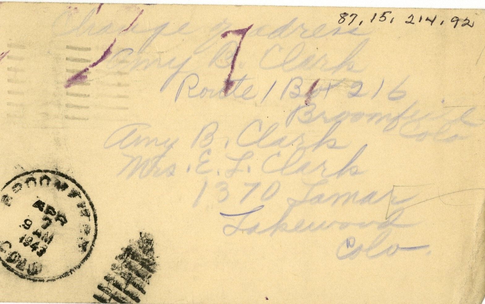 On back: "Change of address. Amy B Clark. Route 1 Box 216 Broomfield, Colo. Amy B. Clark, Mrs. E. L. Clark. 1370 Lamar, Lakewood, Colo." Also a postal stamp from Broomfield, Colo. Apr 7, 1943.Collection