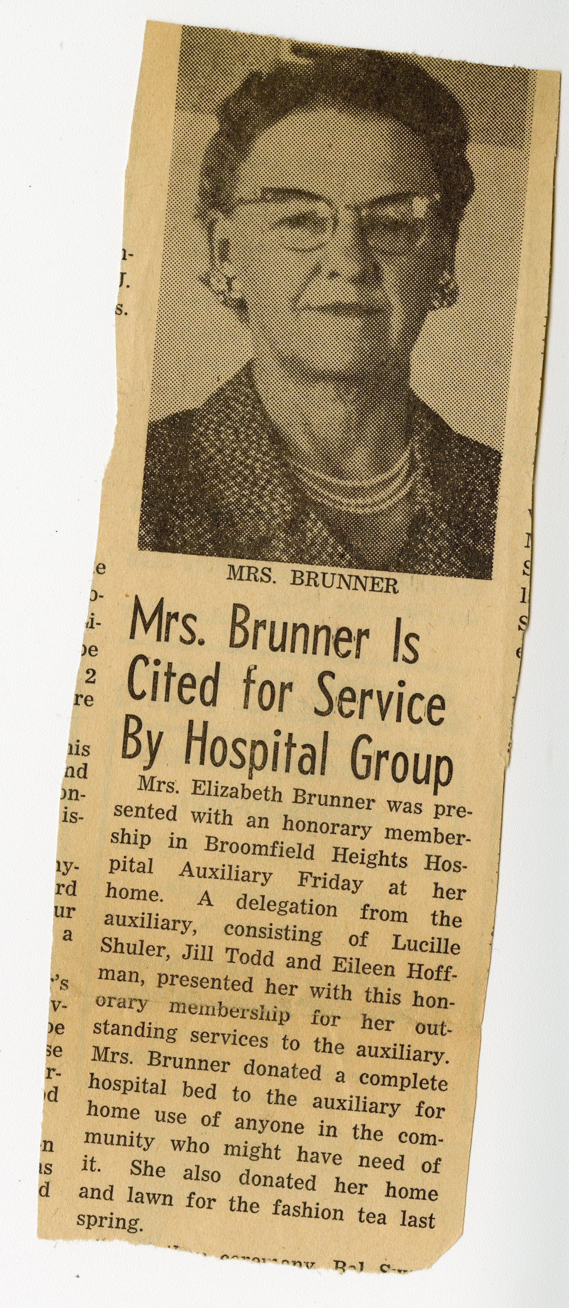 Photograph of Elizabeth Brunner. Photograph accompanied a newspaper article about how she was presented with an honorary membership in the Broomfield Heights Hospital Auxiliary.