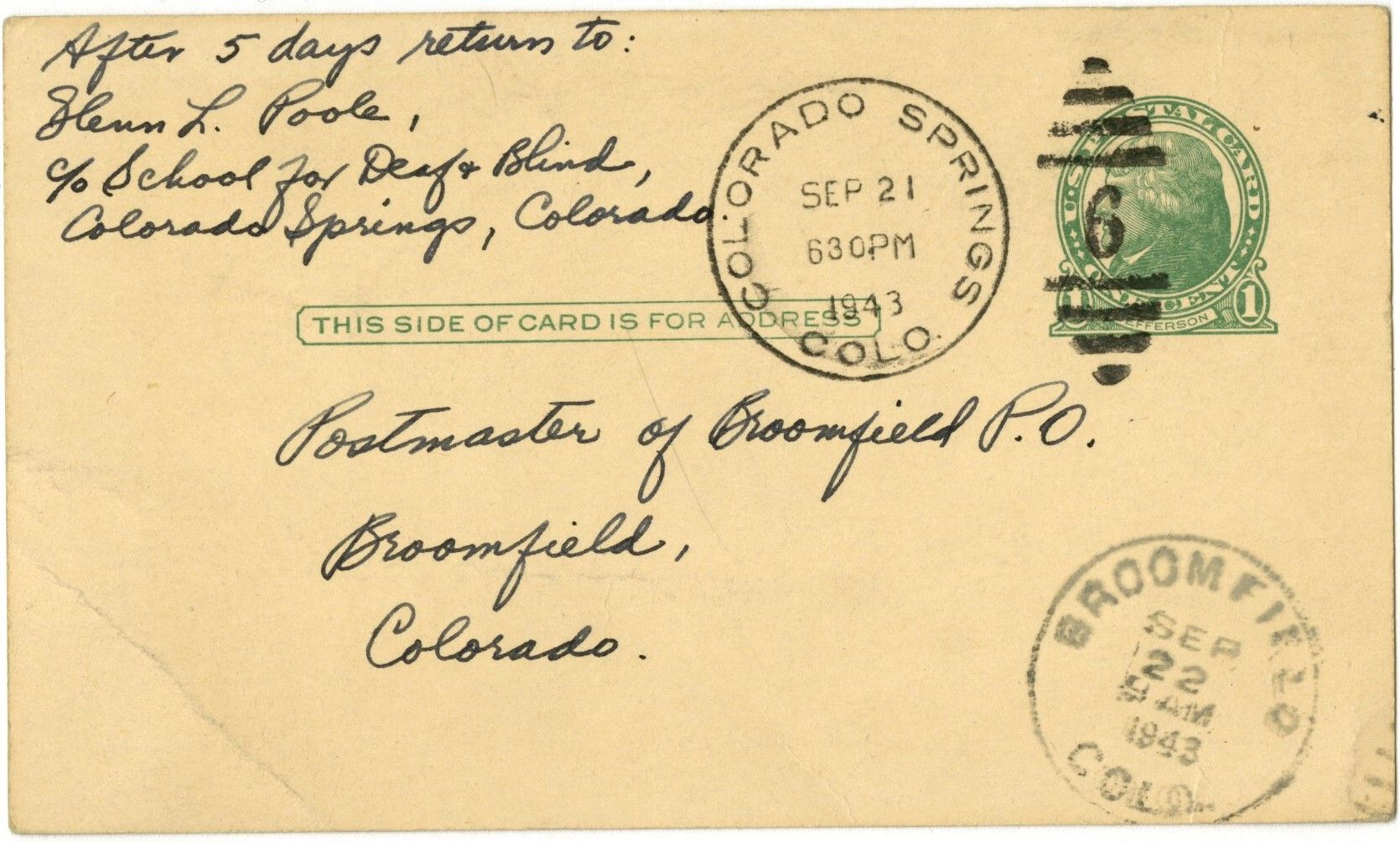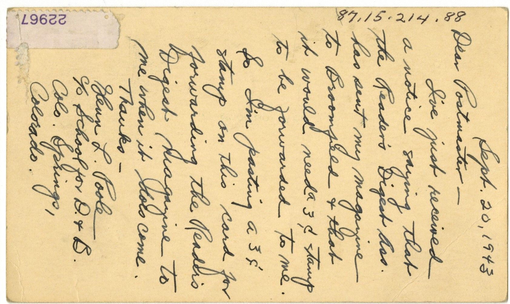 On back: "Sept. 20, 1943. Dear Postmaster- I've just received a notice saying that the Reader's Digest Ass. has sent my magazine to Broomfield + that it would need a 3c stamp to be forwarded to me. So I'm posting a 3c stamp on this card for forwarding the Reader's Digest magazine to me when it does come. Thanks- Glenn L Poole, c/o School for D. + B. Colo. Springs, Colorado."Collection