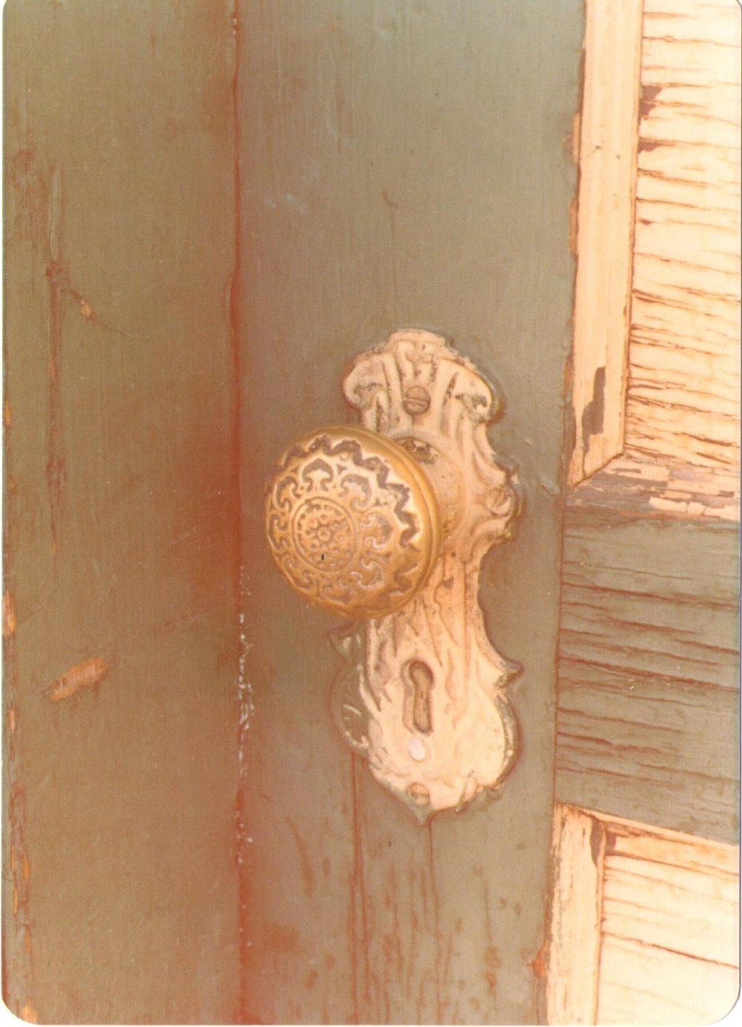 This is a scan of photograph of the Broomfield depot's doorknob. The door is painted forest green and cream, while the ornamental door knob is brass. This is the door leading from the old platform in to the waiting room. The photograph was taken in 1974.