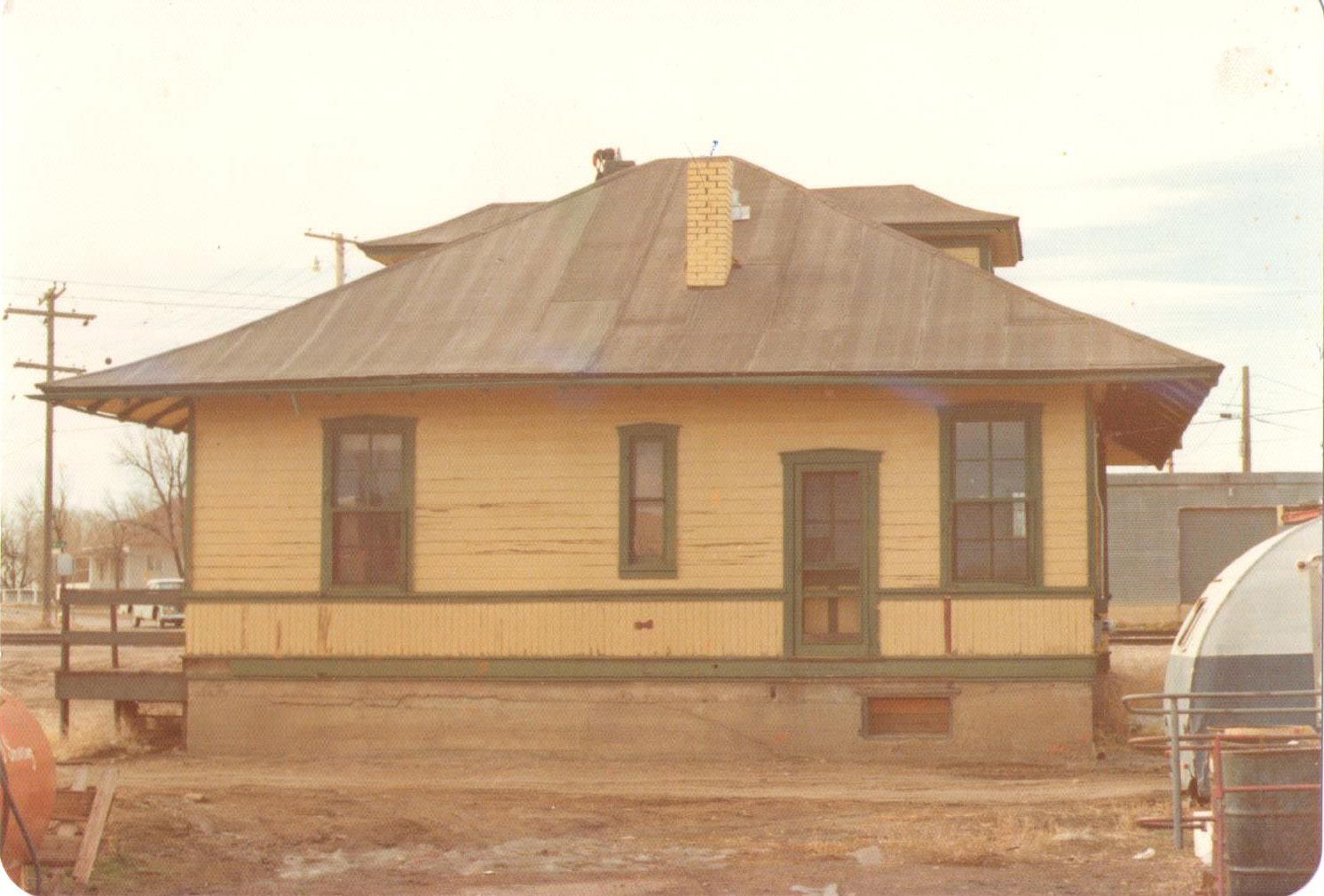 When asked to explain this image donor Karen McGuire described; "Looking SE on original site. Loading dock on left goes into baggage room. Houses in left background are on 120th near corner with HWY 287."