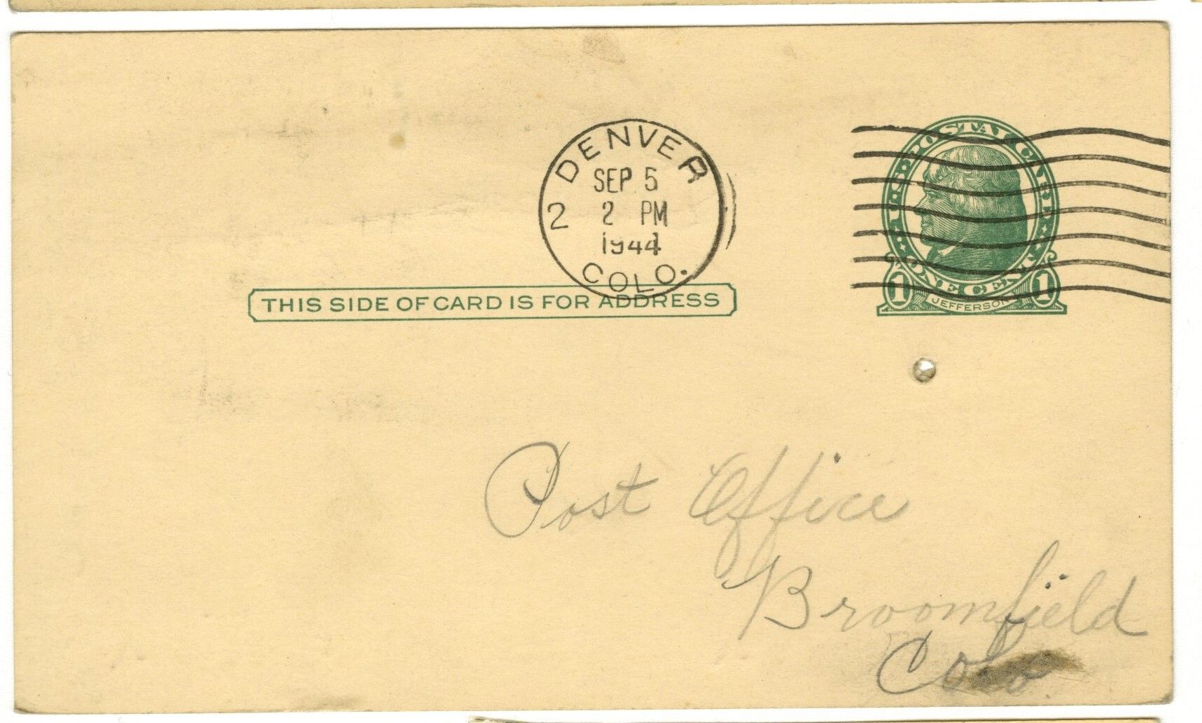 Postcard addressed to "Post Office, Broomfield, Colo." Postage stamp, green, 1c. Postal stamp from Denver, Colo. Sep 5, 1944.