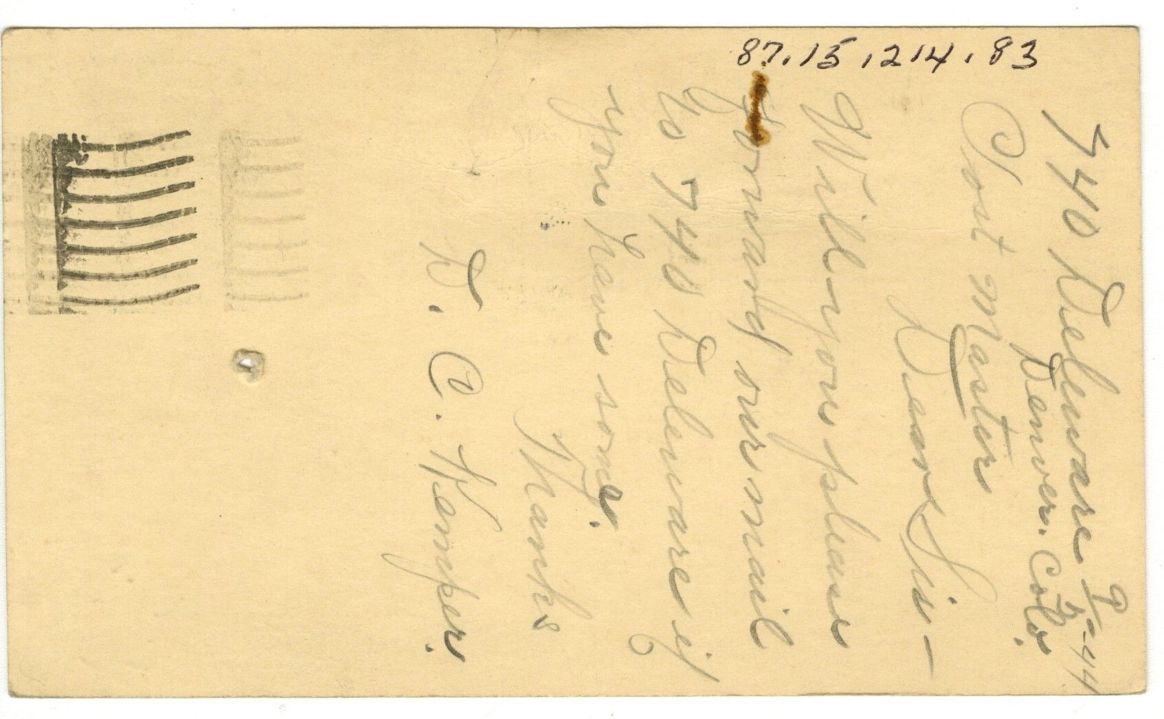 On back: "740 Delaware Denver, Colo. Post Master, Dear Sir- Will you please forward our mail to 740 Delaware if you have some. Thanks, D.C. Kemper."Collection