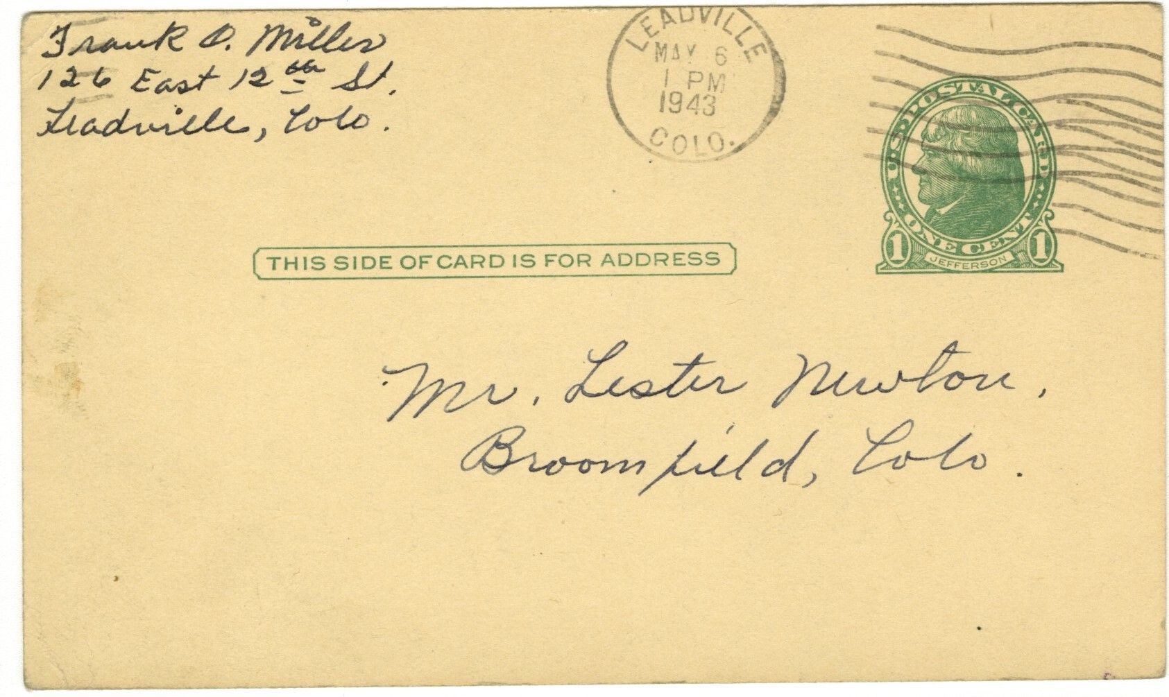 Recipient address: "Frank O. Miller, 126 East 12th St, Leadville, Colo." Postage stamp, green, 1c. Postal stamp from Leadville, Colo. May 6, 1943.