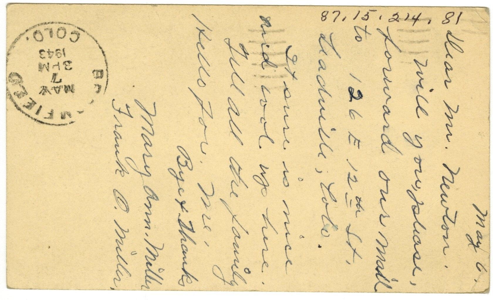 On back: "May 6, Dear Mr. Newton, Will you please, forward our mail to 126 E 12th St. Leadville, Colo. It sure is nice and cool up here. Tell all the family hello for me. Bye + Thanks, Mary Ann Miller. Frank O. Miller." Also postal stamp from Broomfield, Colo. May 7 1943.Collection