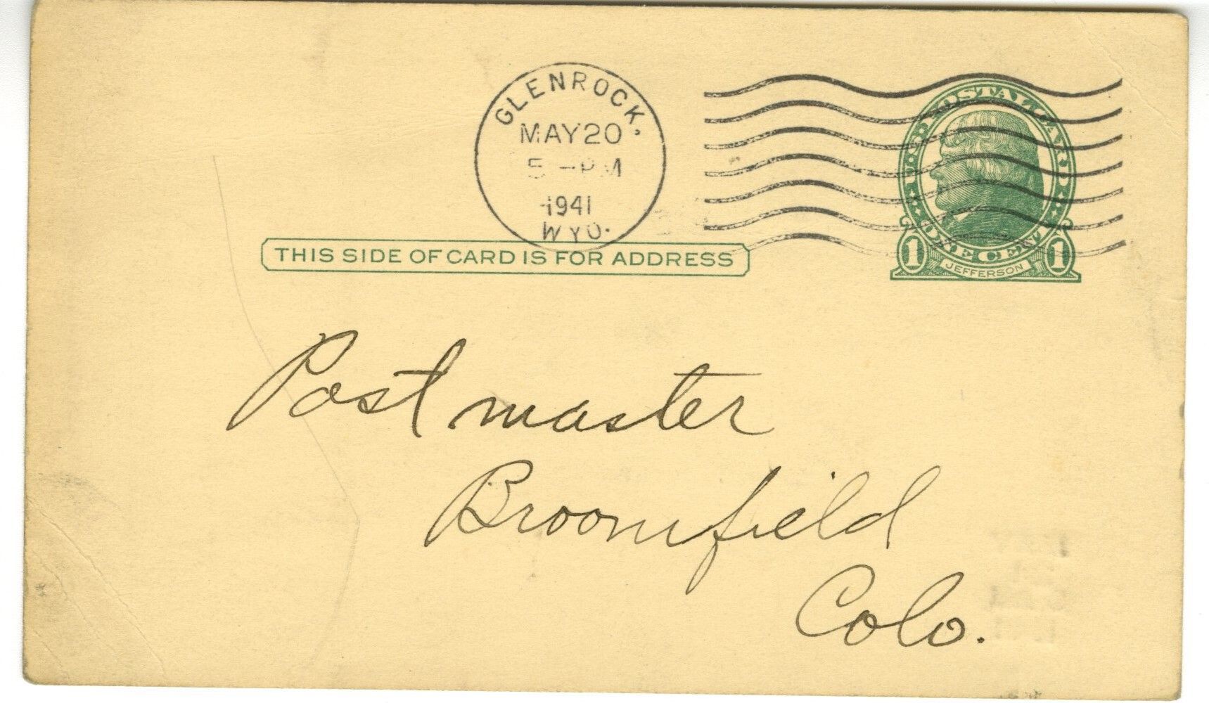 Postcard addressed to "Postmaster, Broomfield, Colo." Postage stamp, green, 1c. Postal stamp from Glenrock, Wyo. May 20, 1941.
