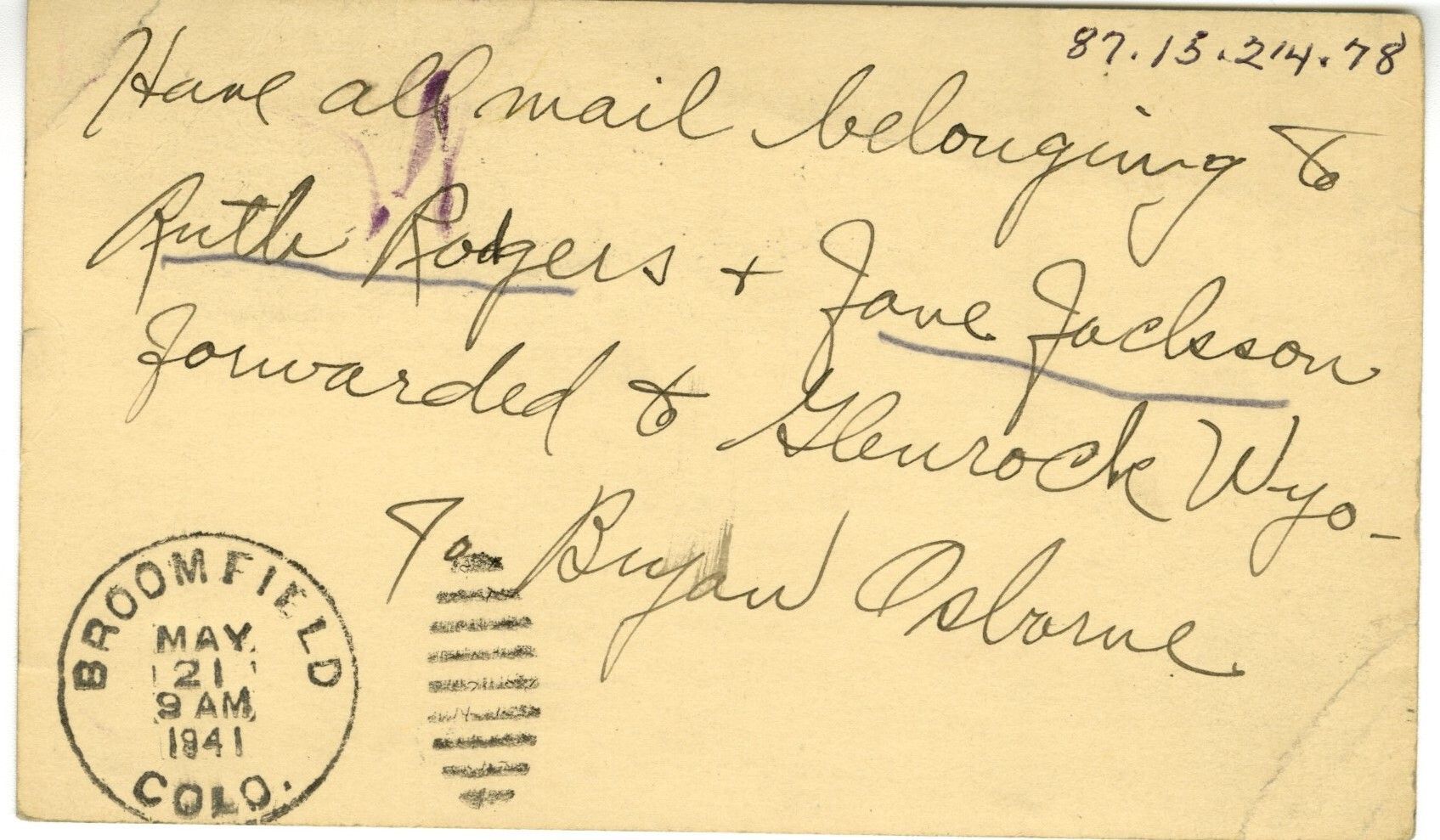 On back: "Have all mail belonging to Ruth Rodgers + Jane Jackson forwarded to Glenrock Wyo- To Bryan Osborne." Also postal stamp from Broomfield, Colo. May 21, 1941.Collection
