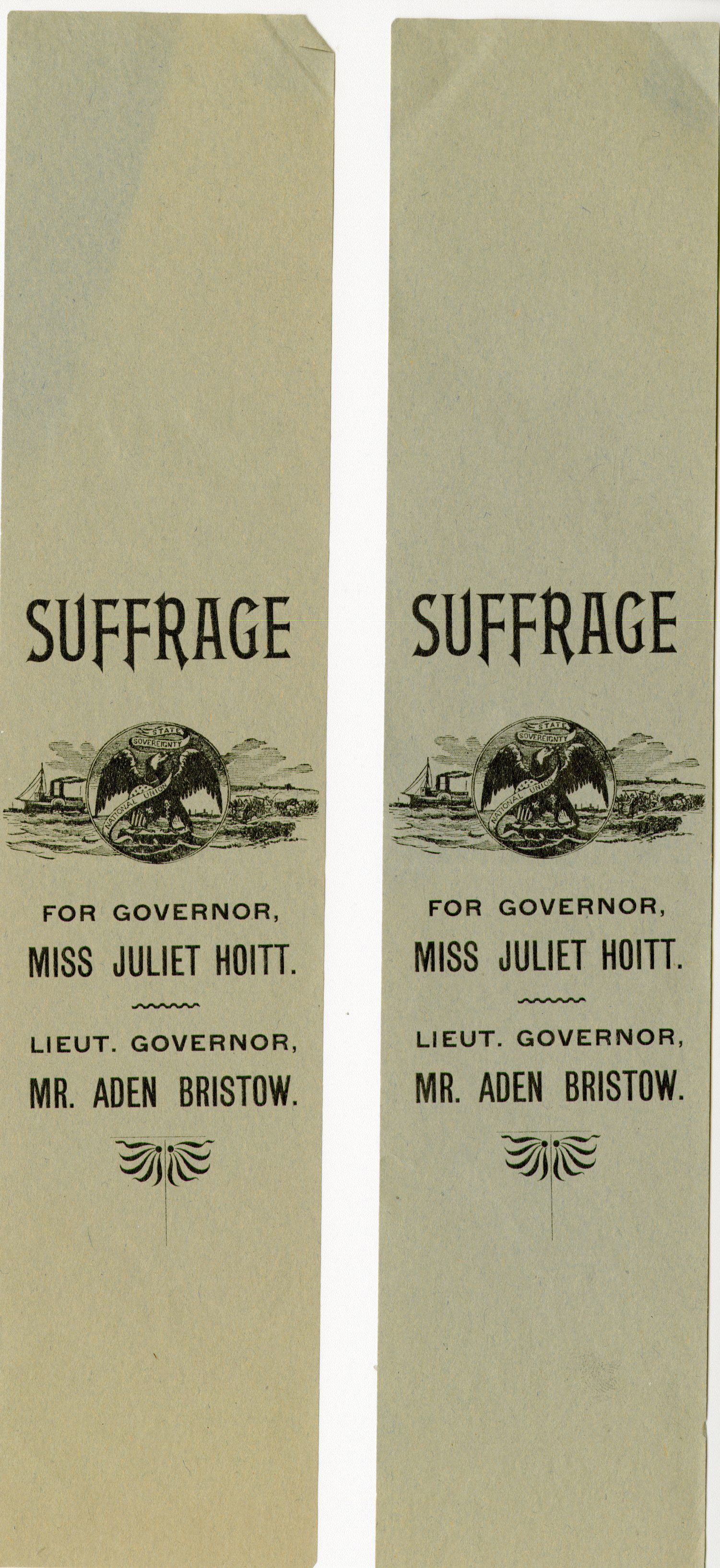 Two 3x11in of thin green slip of papers that says "Suffrage" in the upper middle section, then it has the national union logo with the eagle in a circle and mountains, plains and ocean with a boat on it. Under that, it says, "For Governor, Miss Juliet Hoitt" and then, "Lieut. Governor, Mr. Aden Bristow". It had an upside down squiggles fanned on the end.Collection