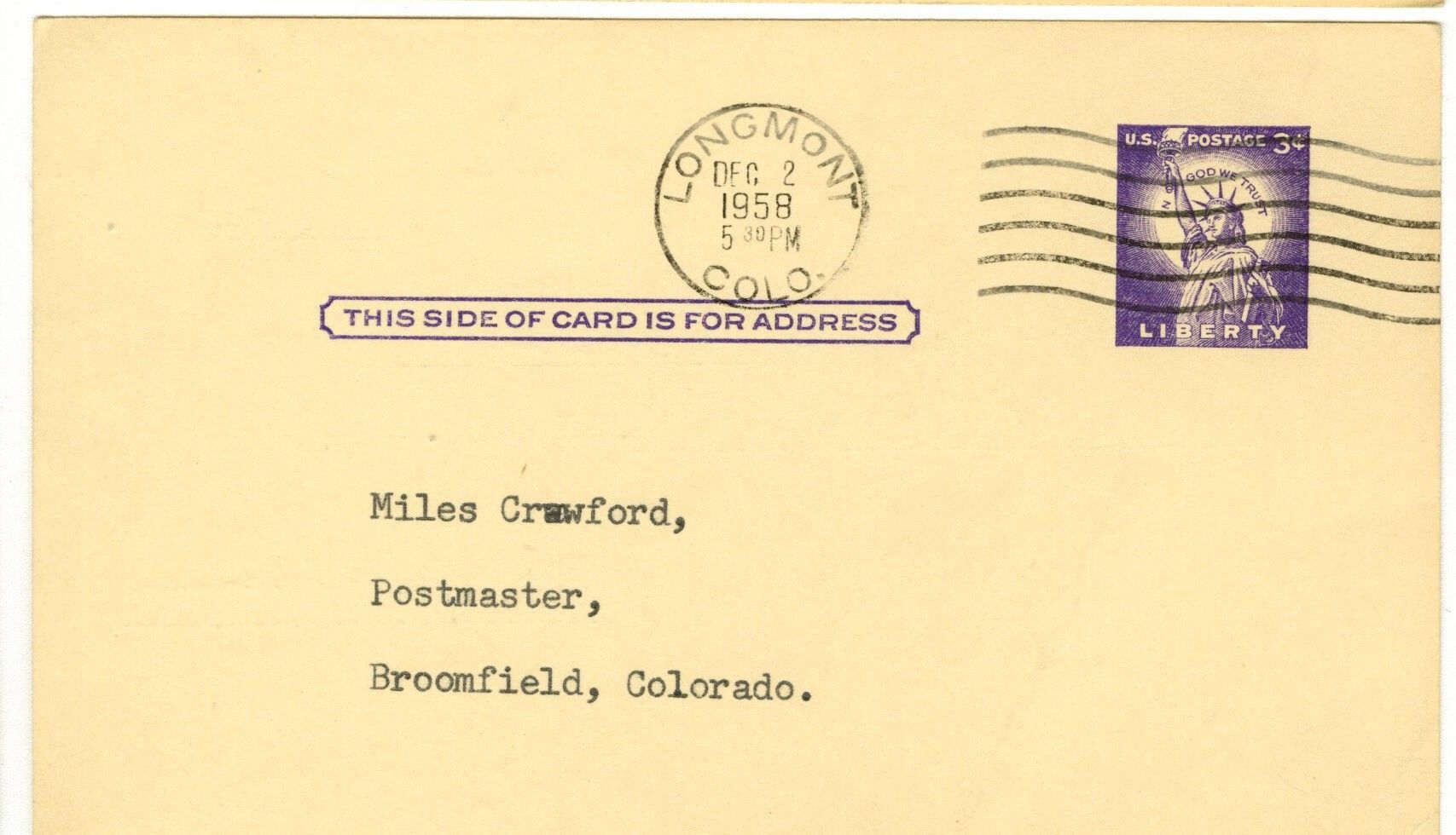 Postcard addressed to "Miles Crawford, Postmaster, Broomfield, Colorado." Postage stamp, purple, 3c. Postal stamp from Longmont, Colo. Dec 2, 1958.
