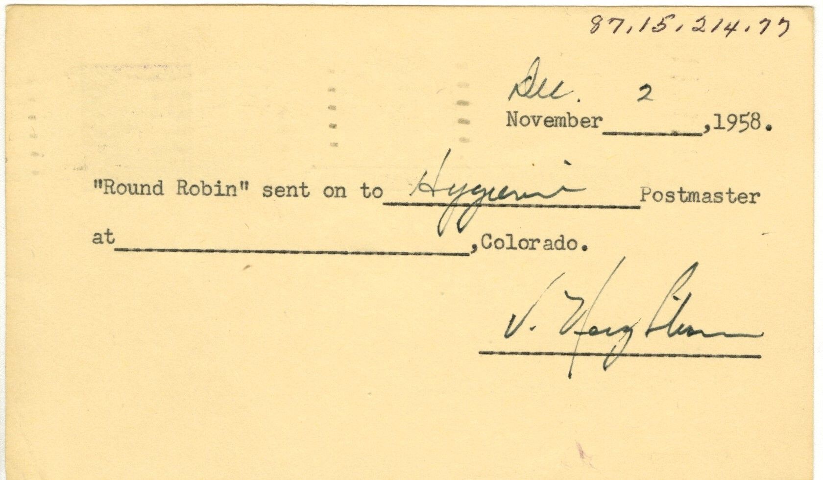 On back: "Dec 2, November ____ 1958. "Round Robin" sent to Hygeini Postmaster at _____, Colorado."Collection