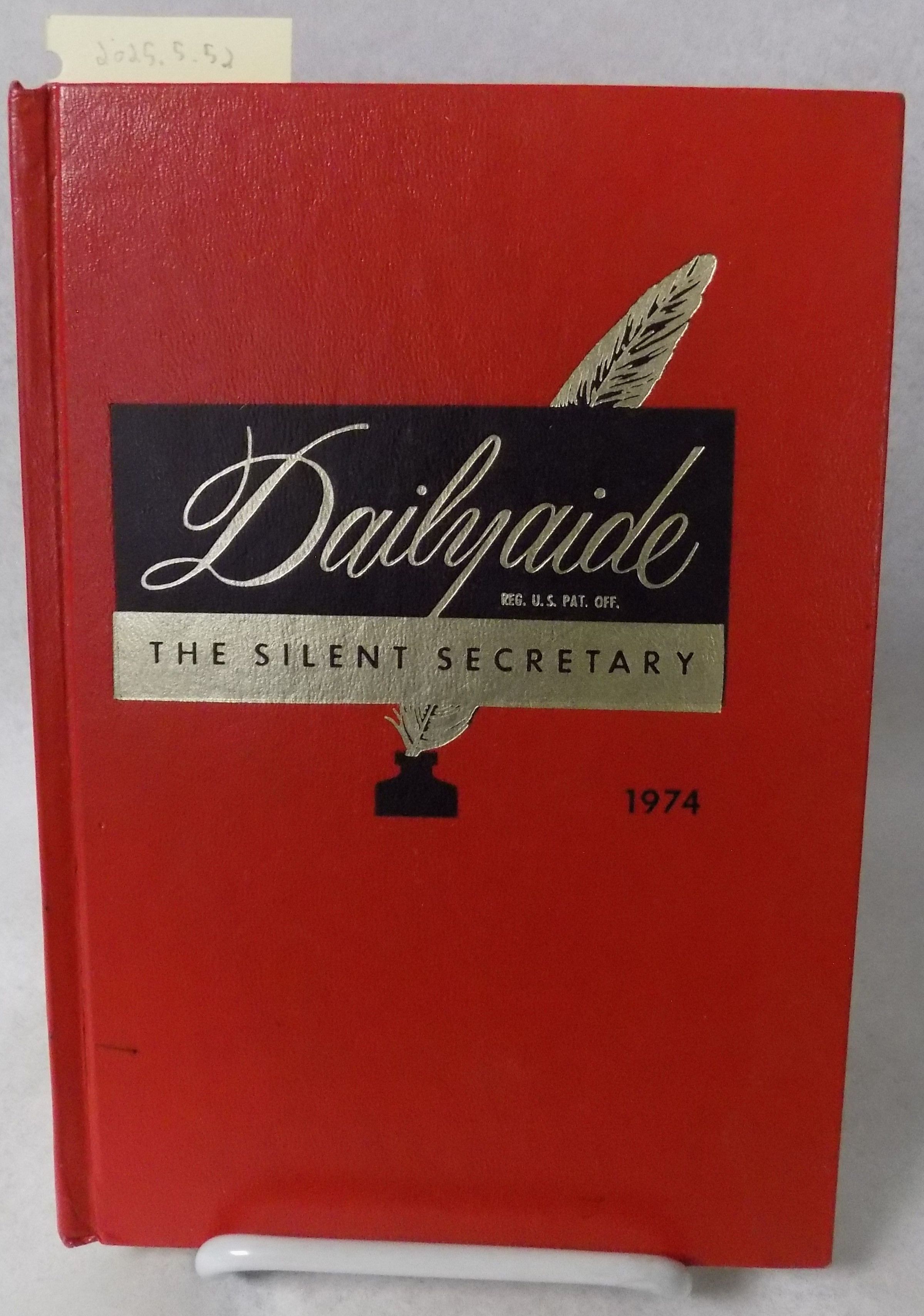 Item is a red hard-bound journal from the year 1974. The front cover features the title "Dailyaide" in golden ink above the words "The Silent Secretary" in black; the image of a quill and ink well is pictured behind these words. The insides of the front and back covers feature a miniature calendar for each month, as well as images of the zodiac signs. The diary belonged to Birdie Viola Crooks, who was born on August 12, 1889 in Arvada, Colorado. Her family moved to Broomfield in 1893 when she was four years old, and she lived there for ninety years until her death on August 1, 1985. Crooks documented each day of her life from January through December, providing invaluable insight into the Broomfield lifestyle in 1974. Tucked into one of the pages is a ticket from Safeway, likely a receipt from purchasing gas.
