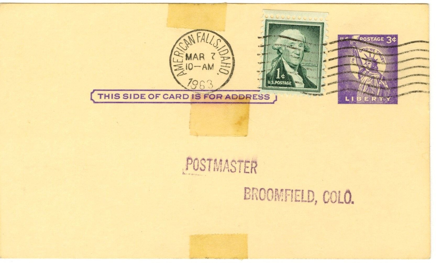 Postcard addressed to "Postmaster, Broomfield, Colo." Postage stamps, green, 1c, and purple, 3c. Postal stamp from American Falls, Idaho, Mar 7, 1963. Tape on top middle, and bottom middle edges. Another peice of tape under postal stamp.Collection
