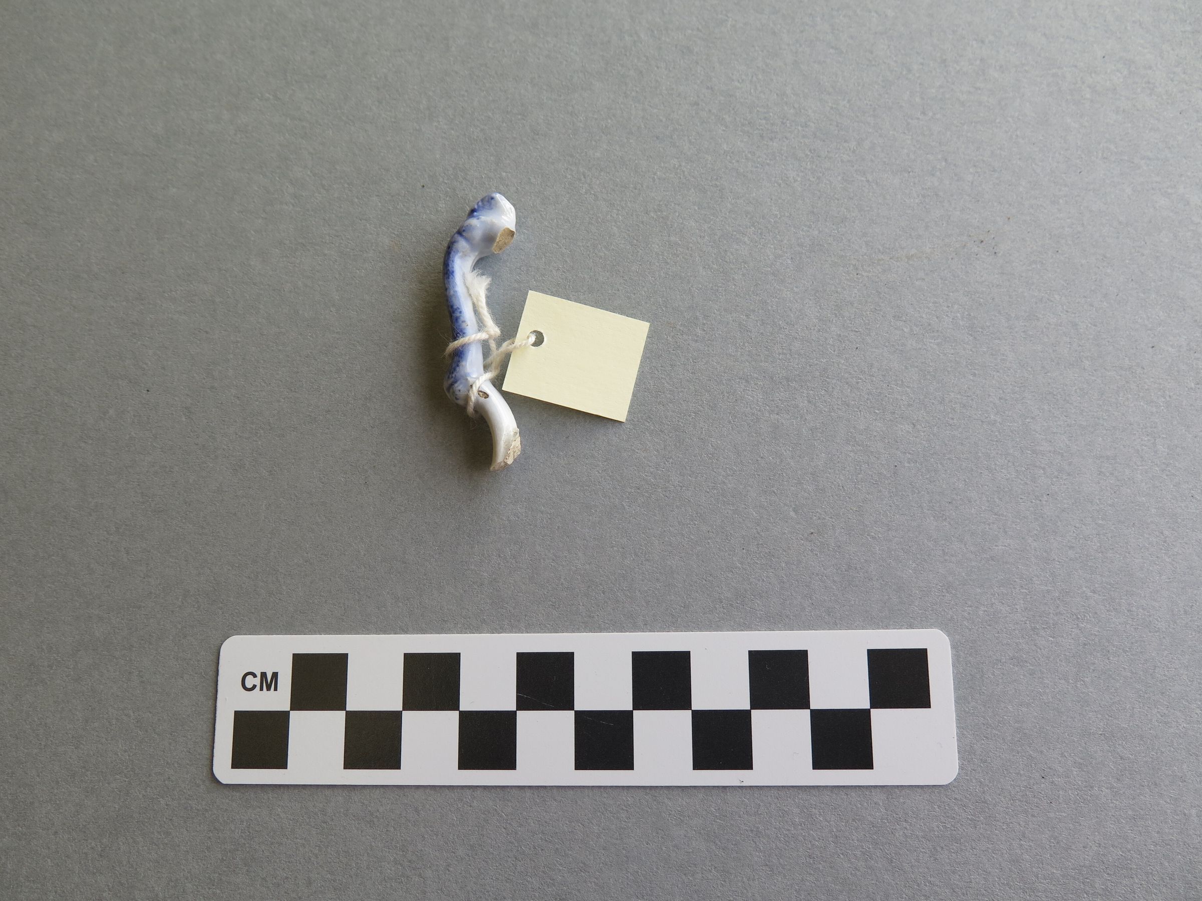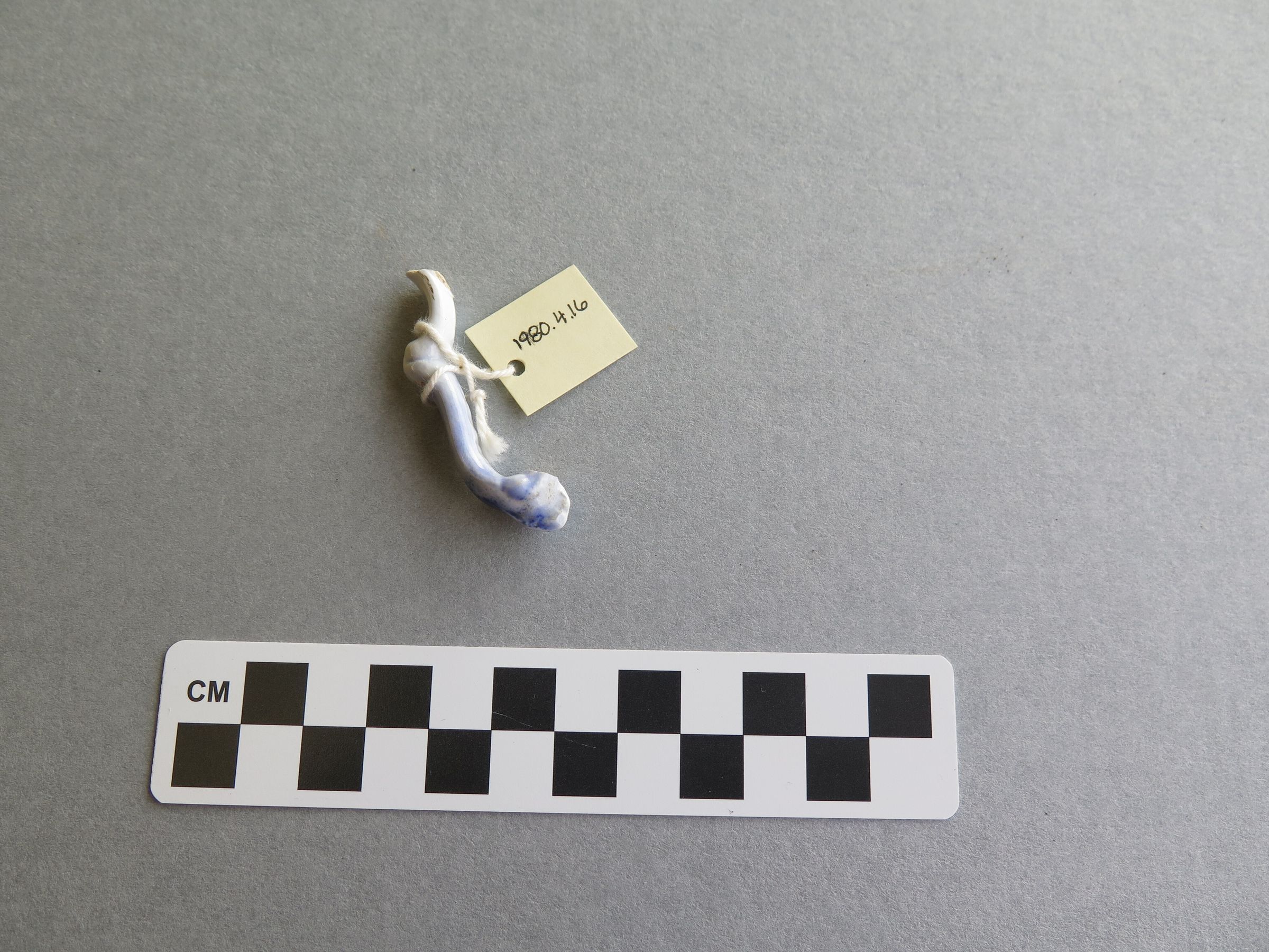 This is a fragment of whiteware. It has raised dots and decorative design with a flower impressed design. It is white glazed and has a straight rim. The fragment measures .5" (h) x 4.5" (w) x 3" (l).